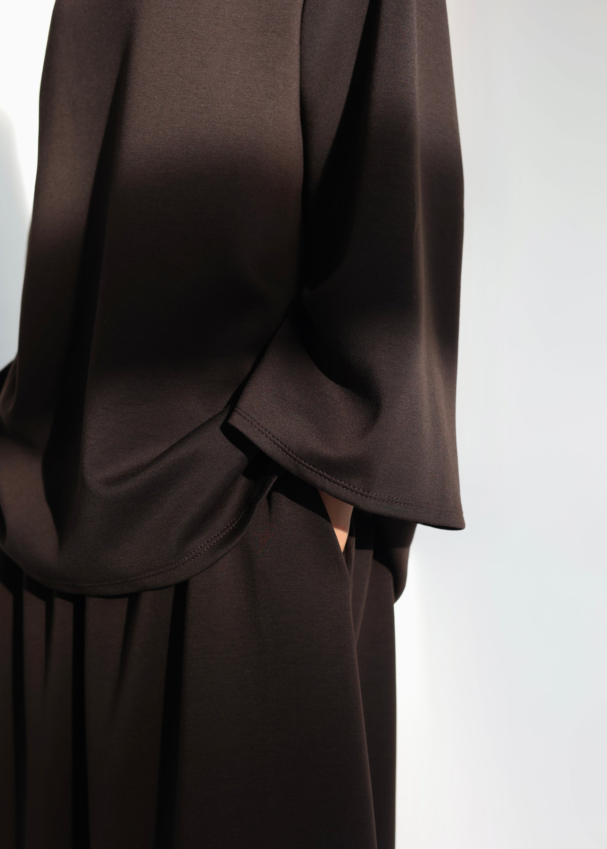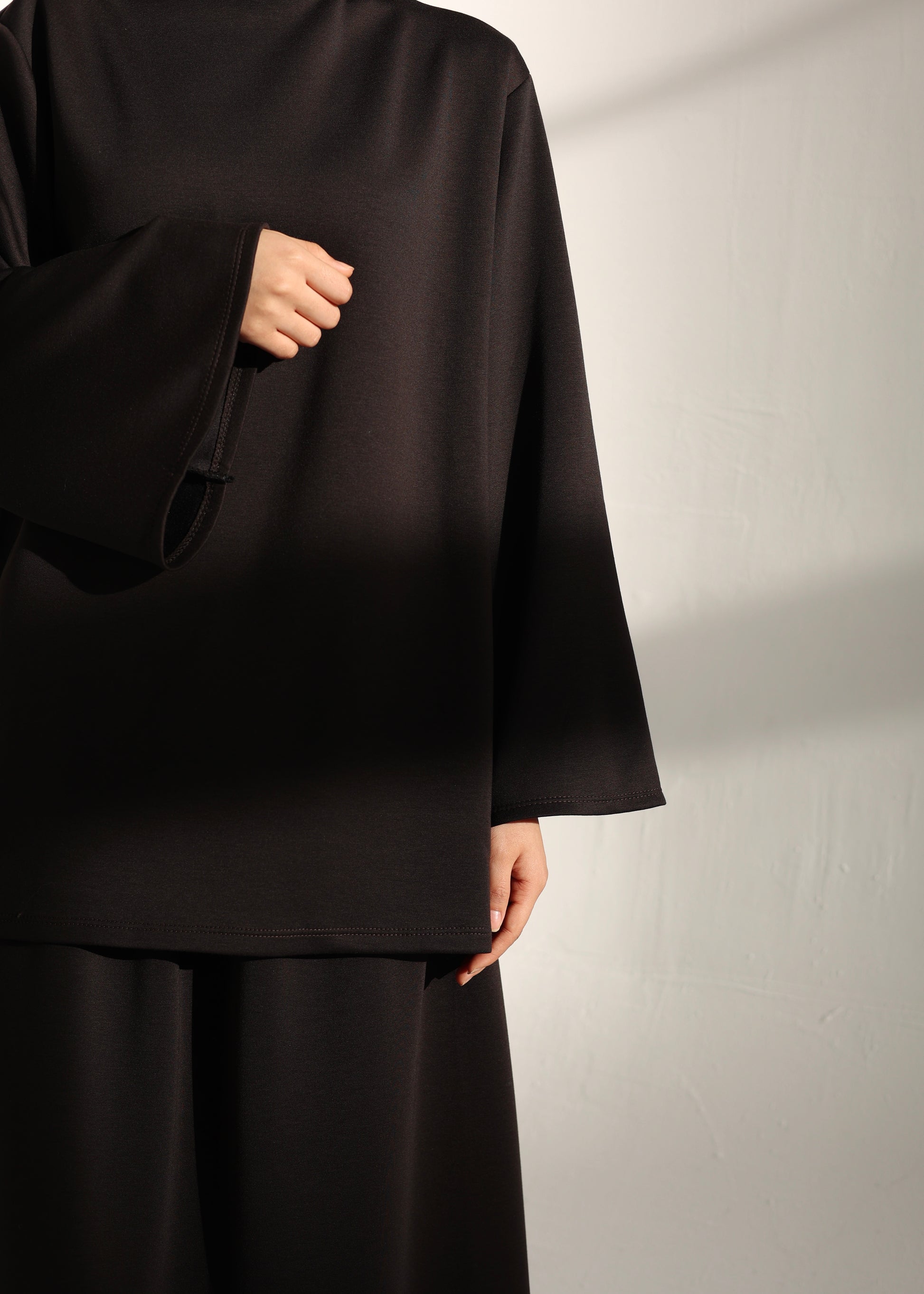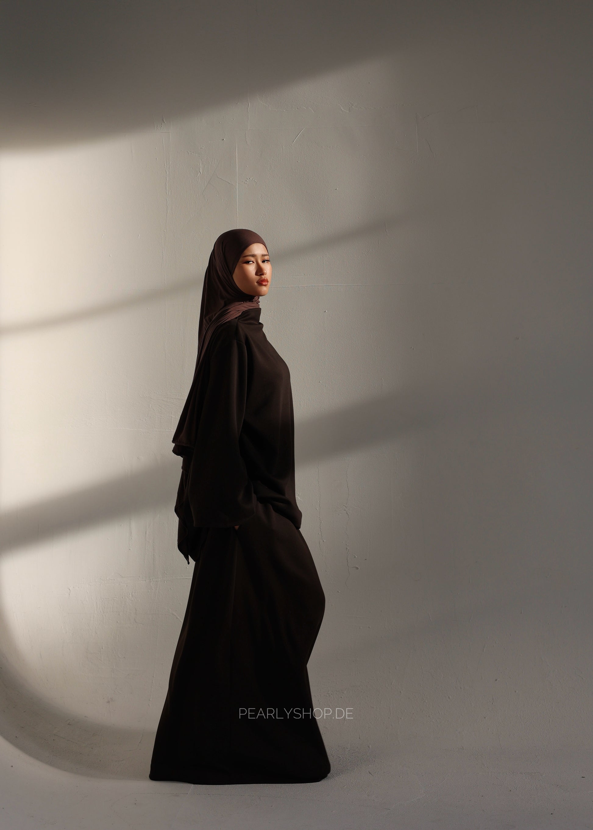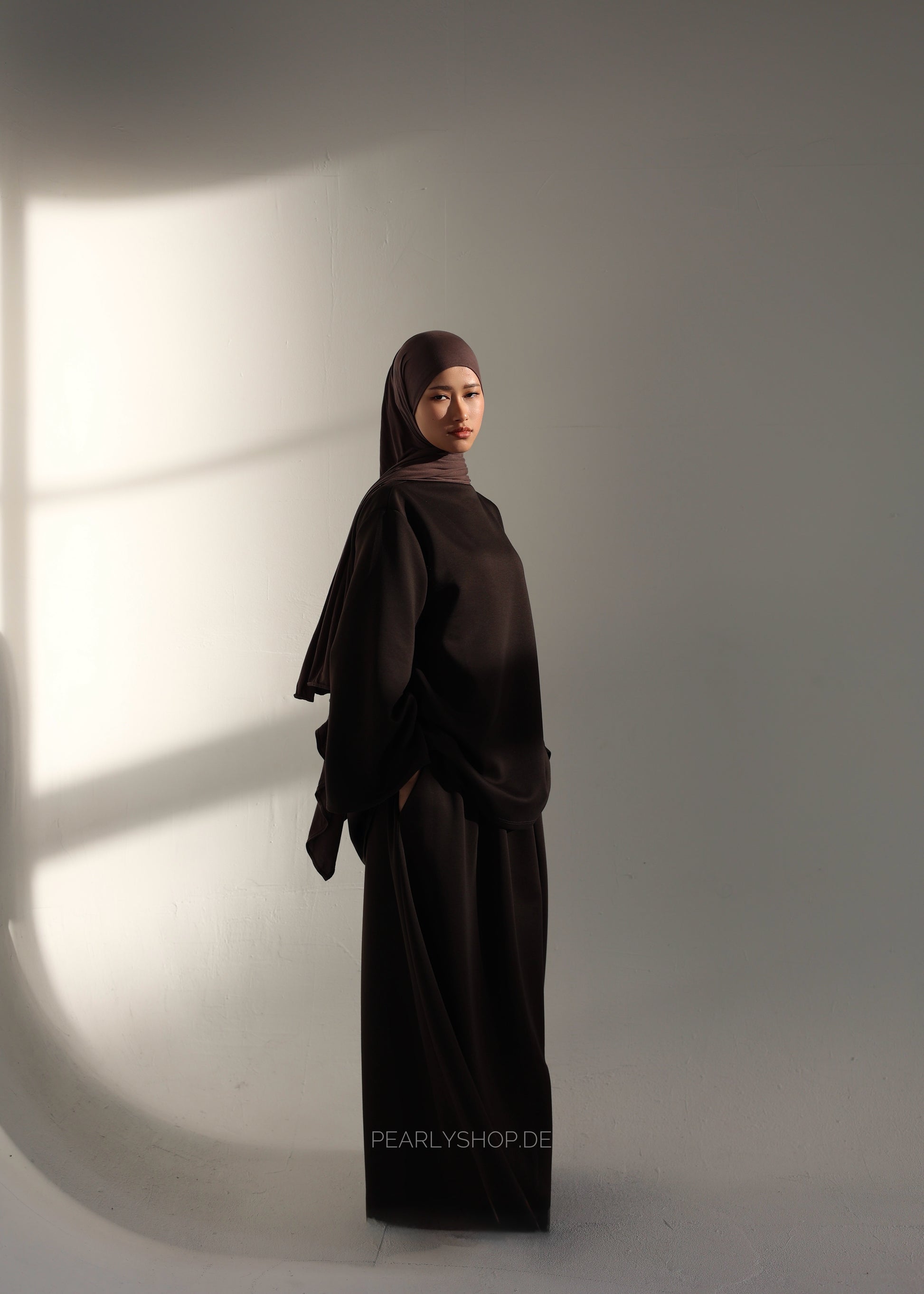 Dieser moderne Maxi-Zweiteiler vereint Komfort, Bewegungsfreiheit und einen sportlich-modesten Look. Das locker geschnittene Oberteil mit hohem Kragen und weiten Ärmeln sorgt für eine entspannte Silhouette und ein angenehmes Tragegefühl. Der weite, fließende Rock ergänzt das Design perfekt und bietet maximalen Komfort im Alltag.
