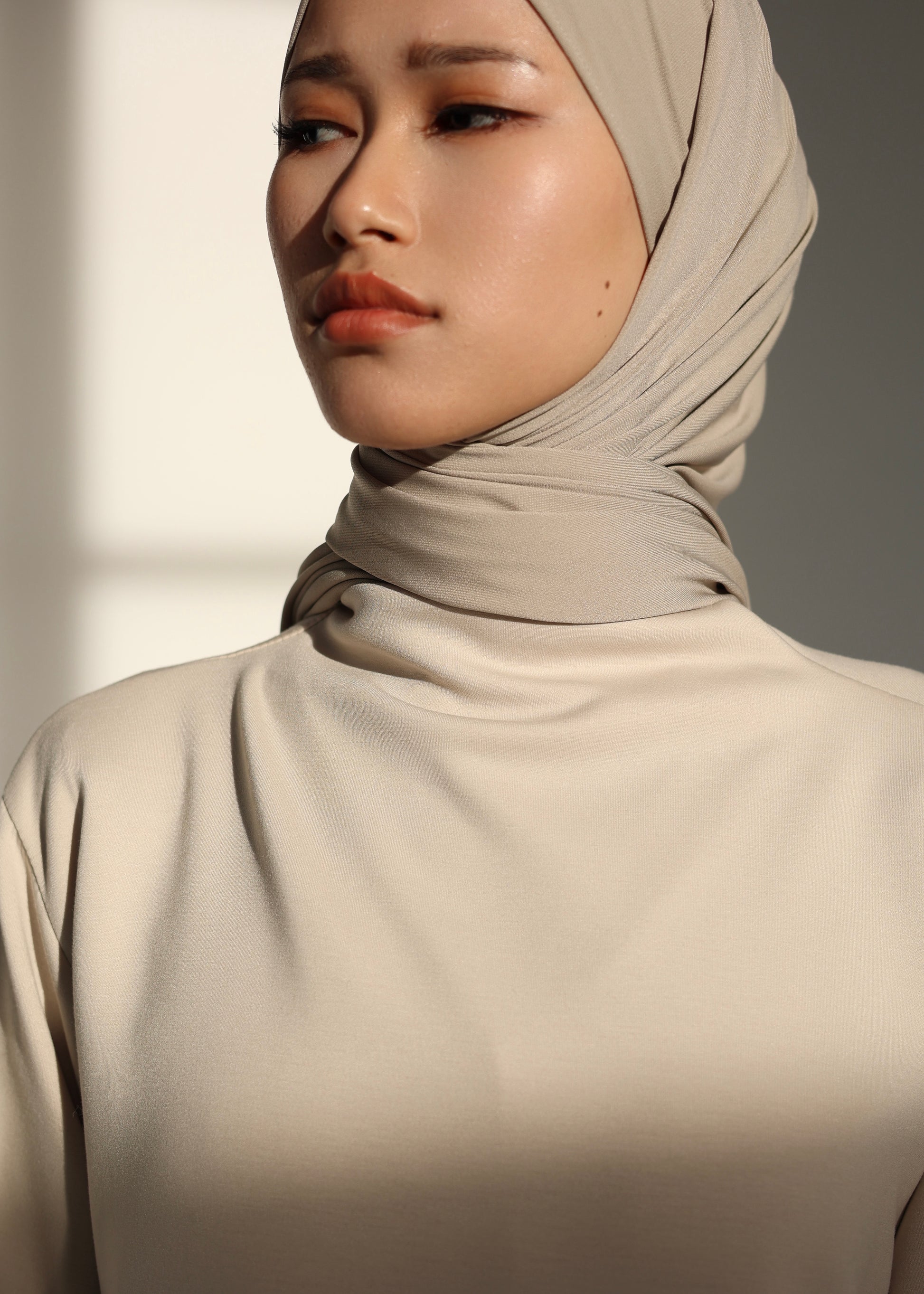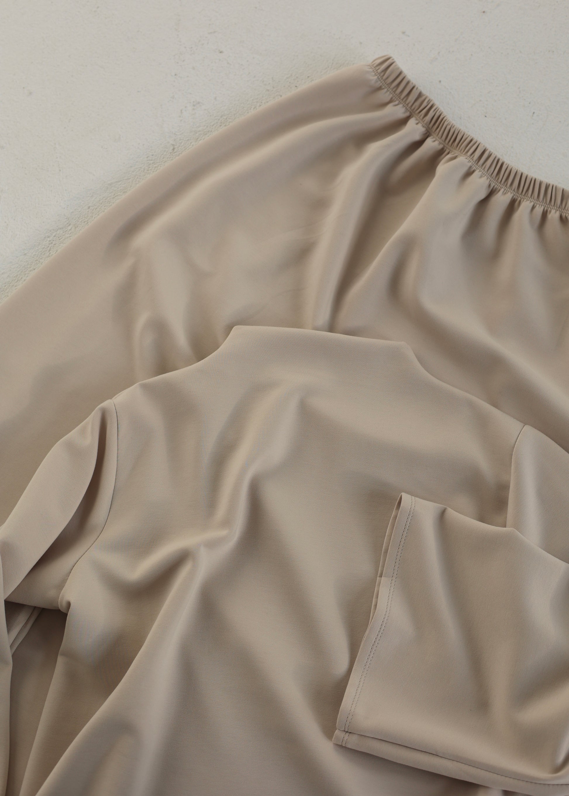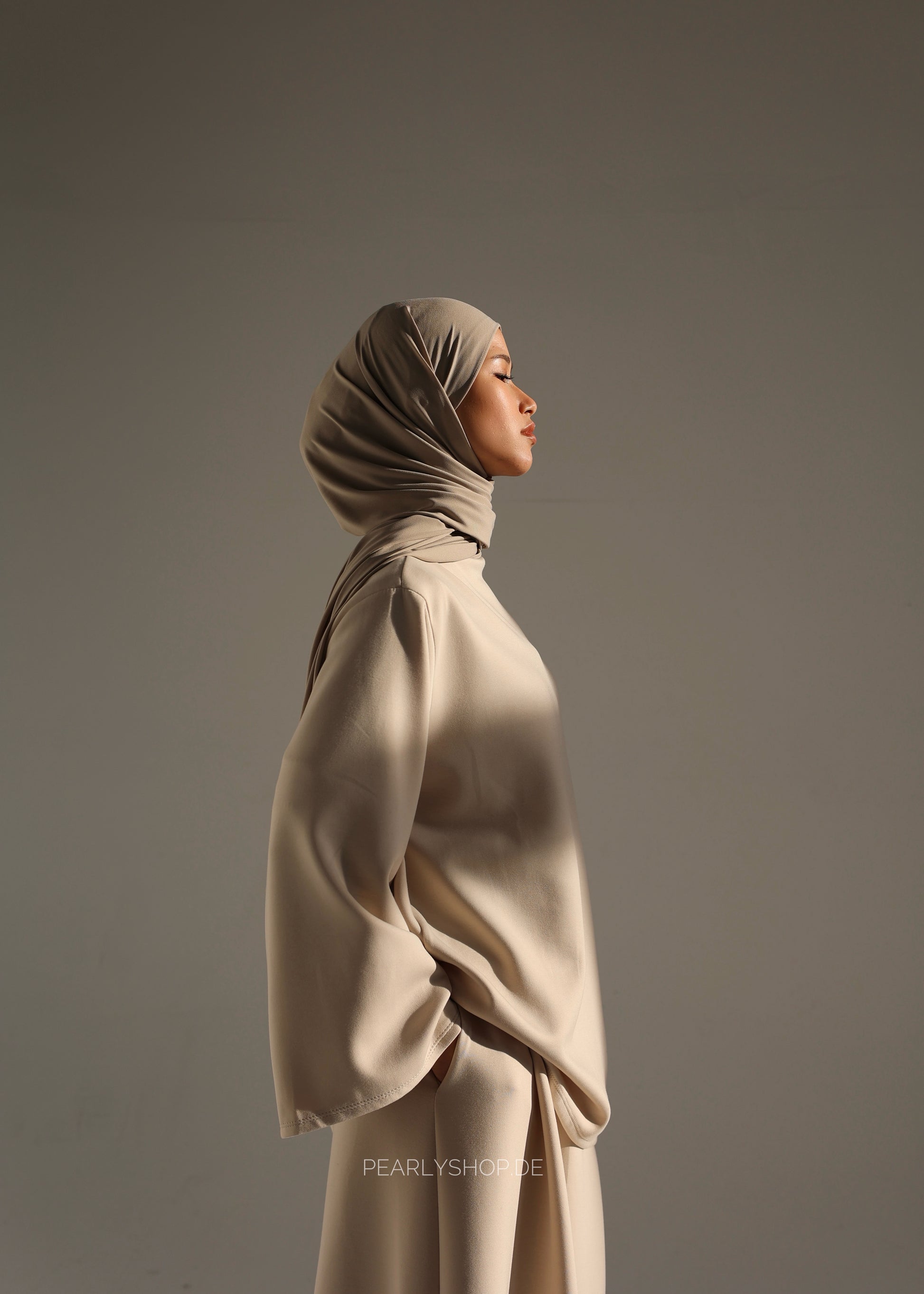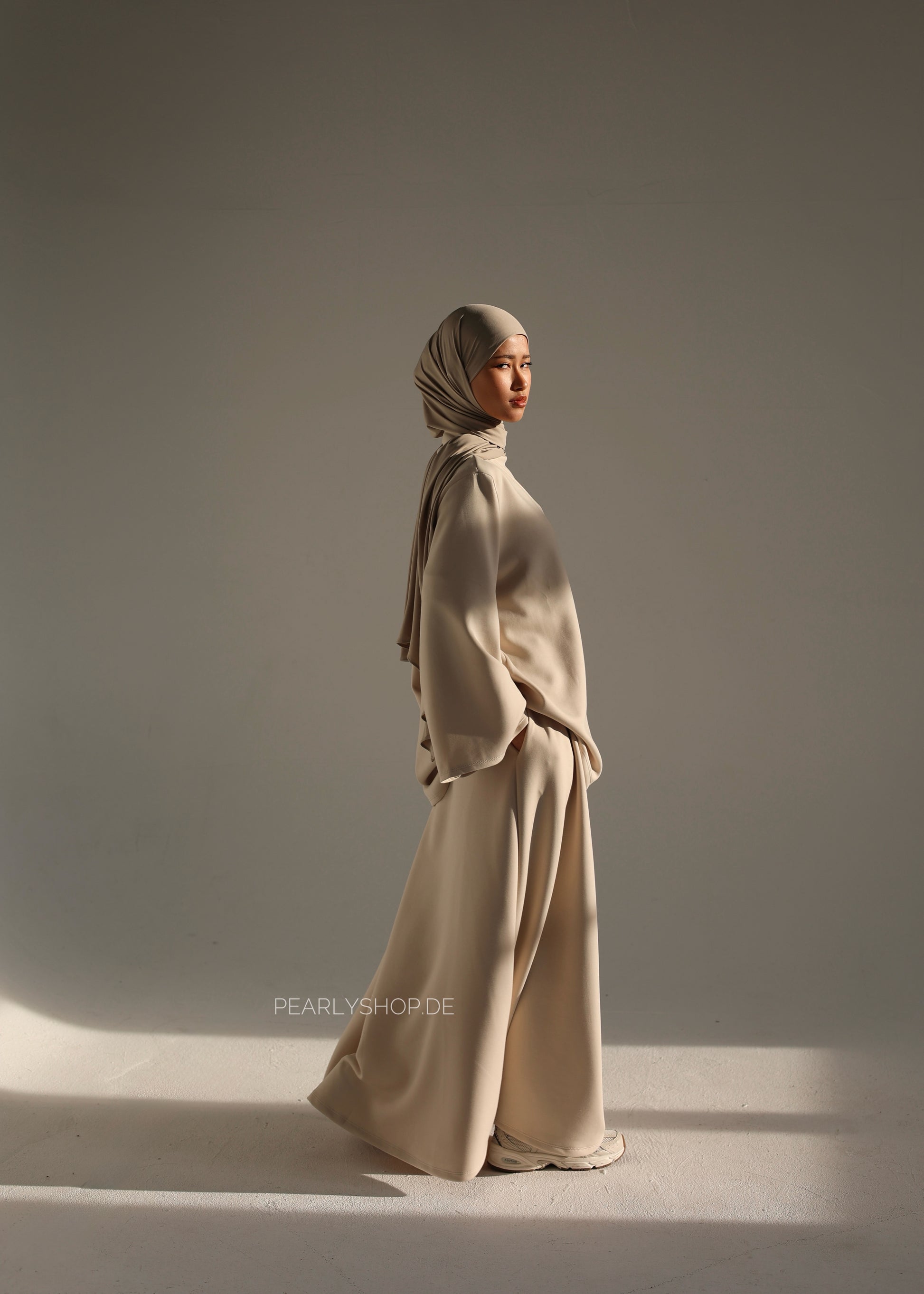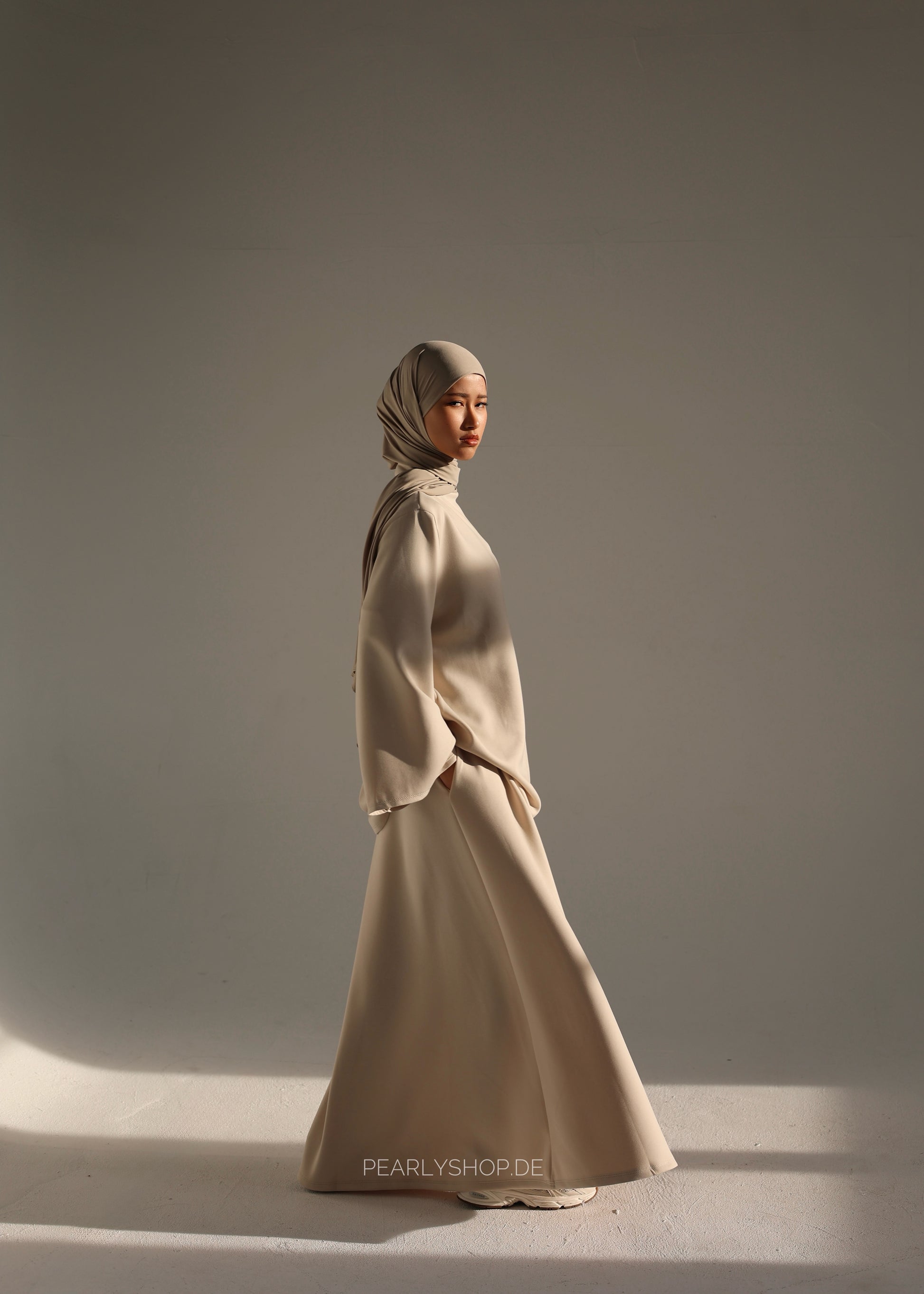 Dieser moderne Maxi-Zweiteiler vereint Komfort, Bewegungsfreiheit und einen sportlich-modesten Look. Das locker geschnittene Oberteil mit hohem Kragen und weiten Ärmeln sorgt für eine entspannte Silhouette und ein angenehmes Tragegefühl. Der weite, fließende Rock ergänzt das Design perfekt und bietet maximalen Komfort im Alltag.