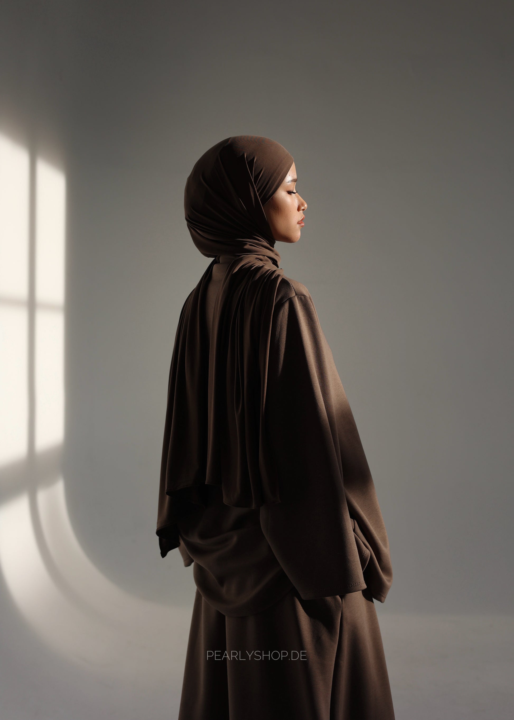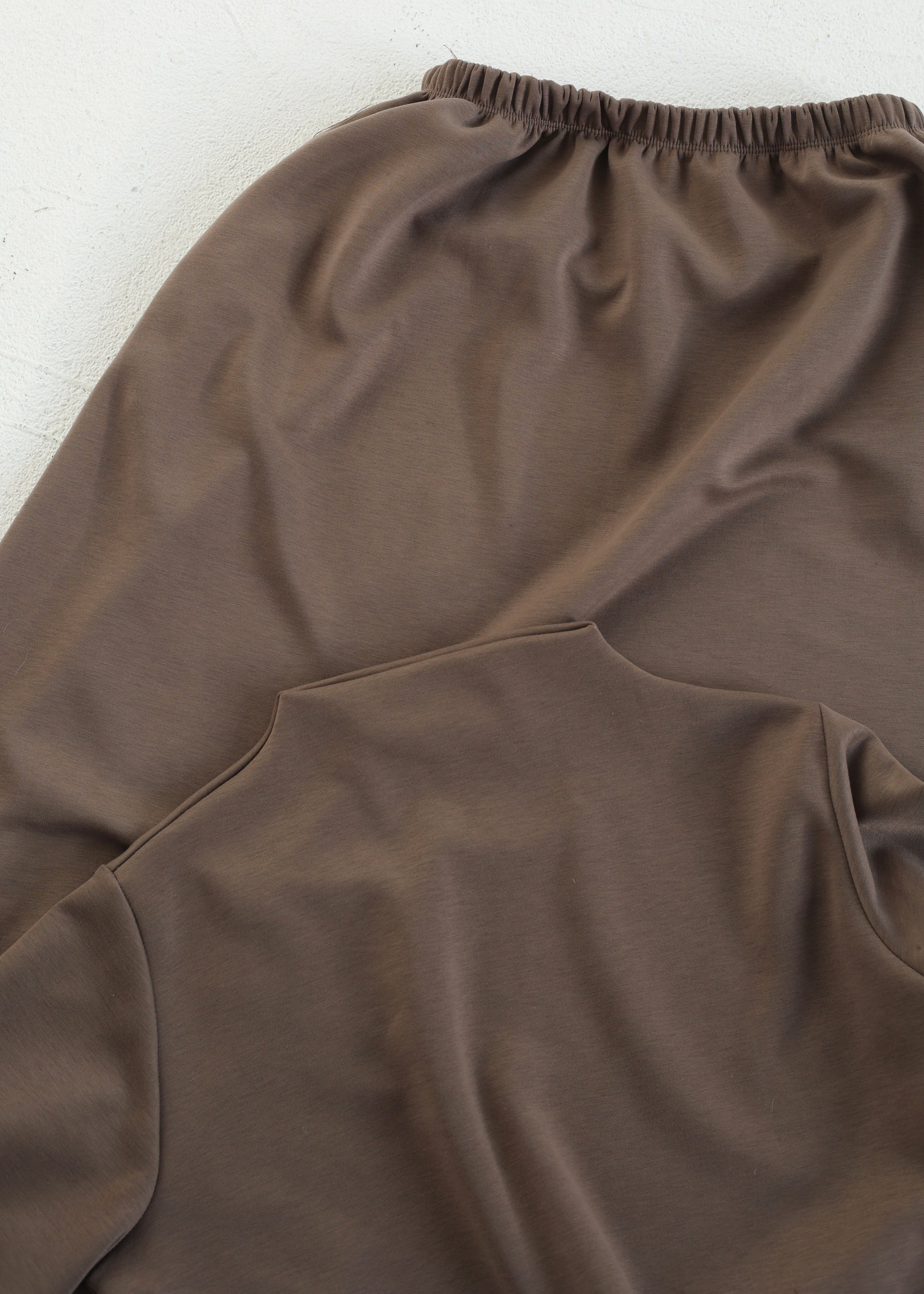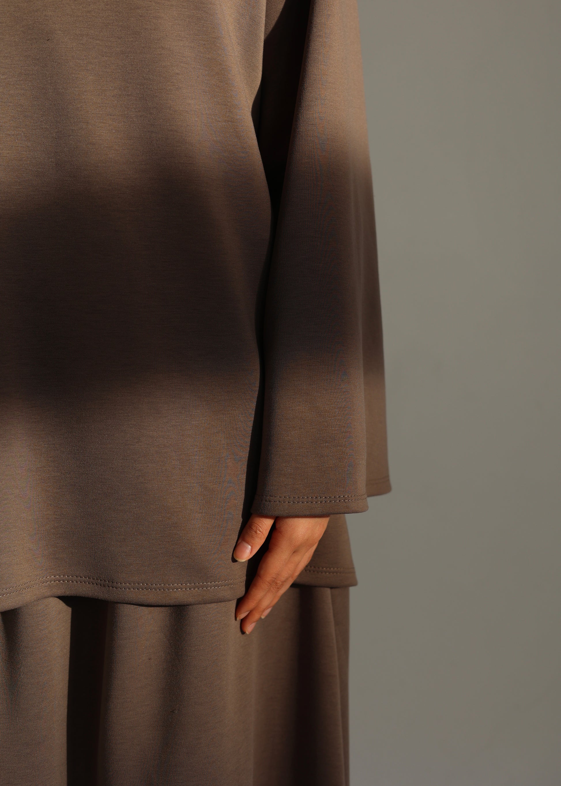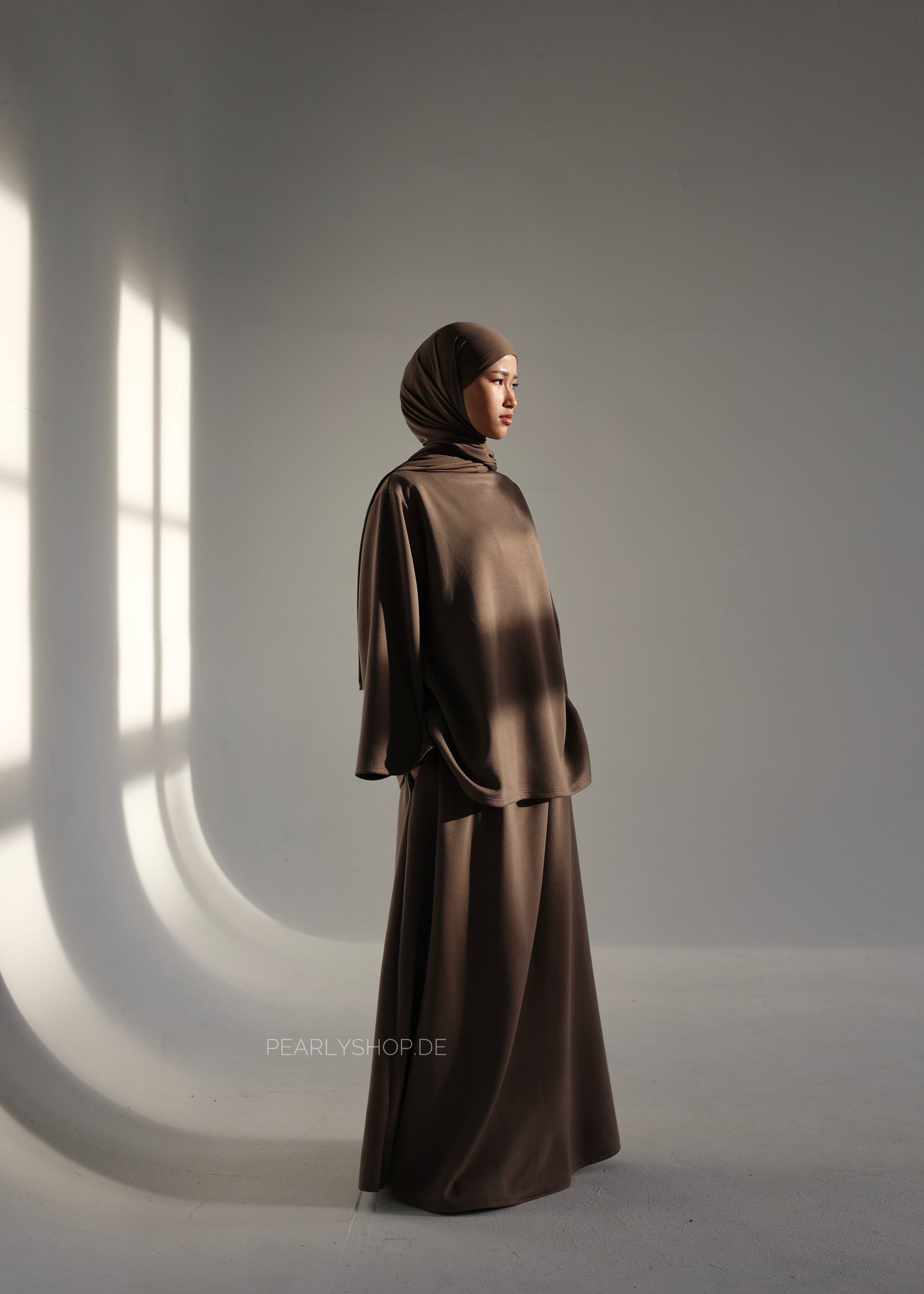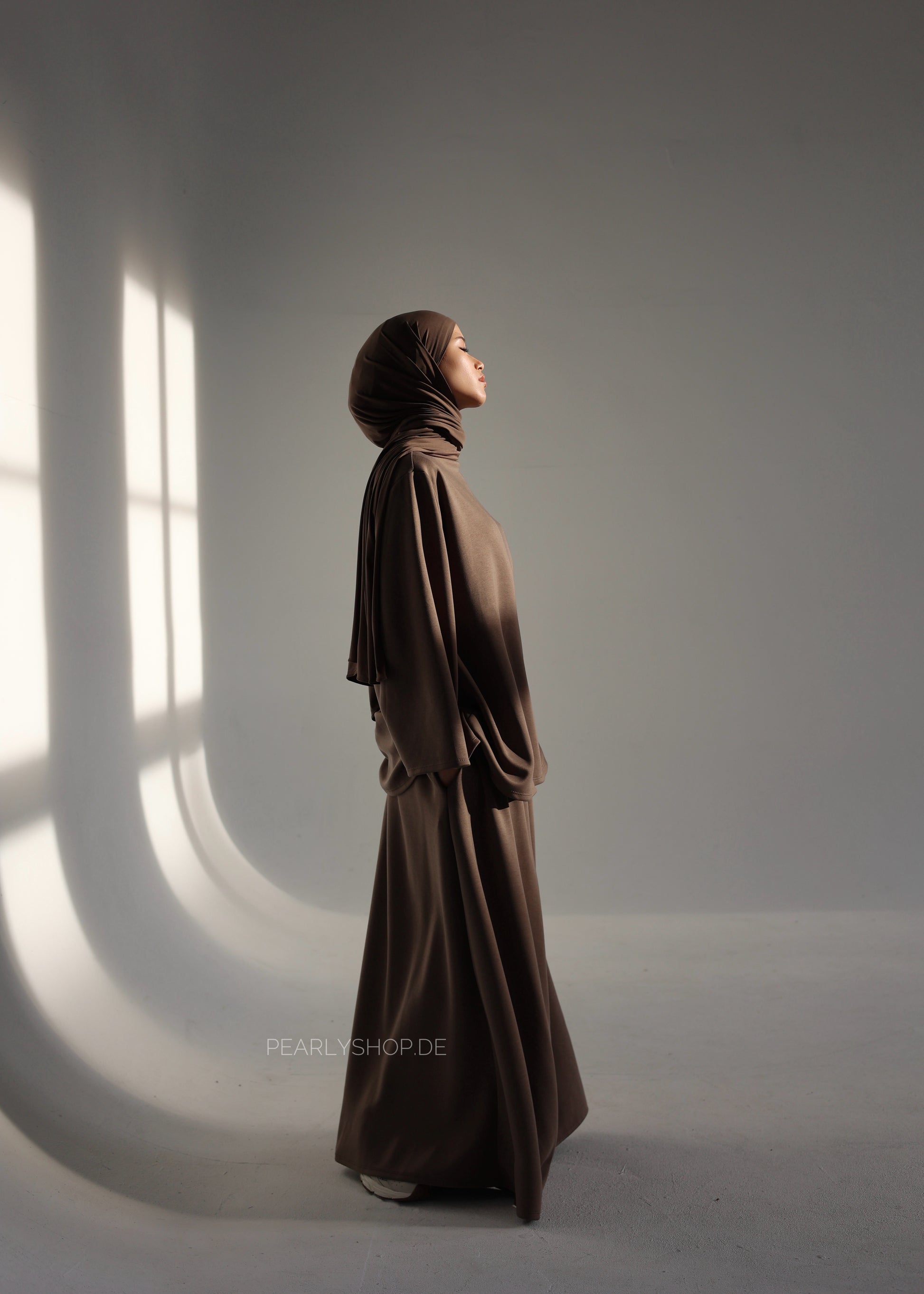 Dieser moderne Maxi-Zweiteiler vereint Komfort, Bewegungsfreiheit und einen sportlich-modesten Look. Das locker geschnittene Oberteil mit hohem Kragen und weiten Ärmeln sorgt für eine entspannte Silhouette und ein angenehmes Tragegefühl. Der weite, fließende Rock ergänzt das Design perfekt und bietet maximalen Komfort im Alltag.