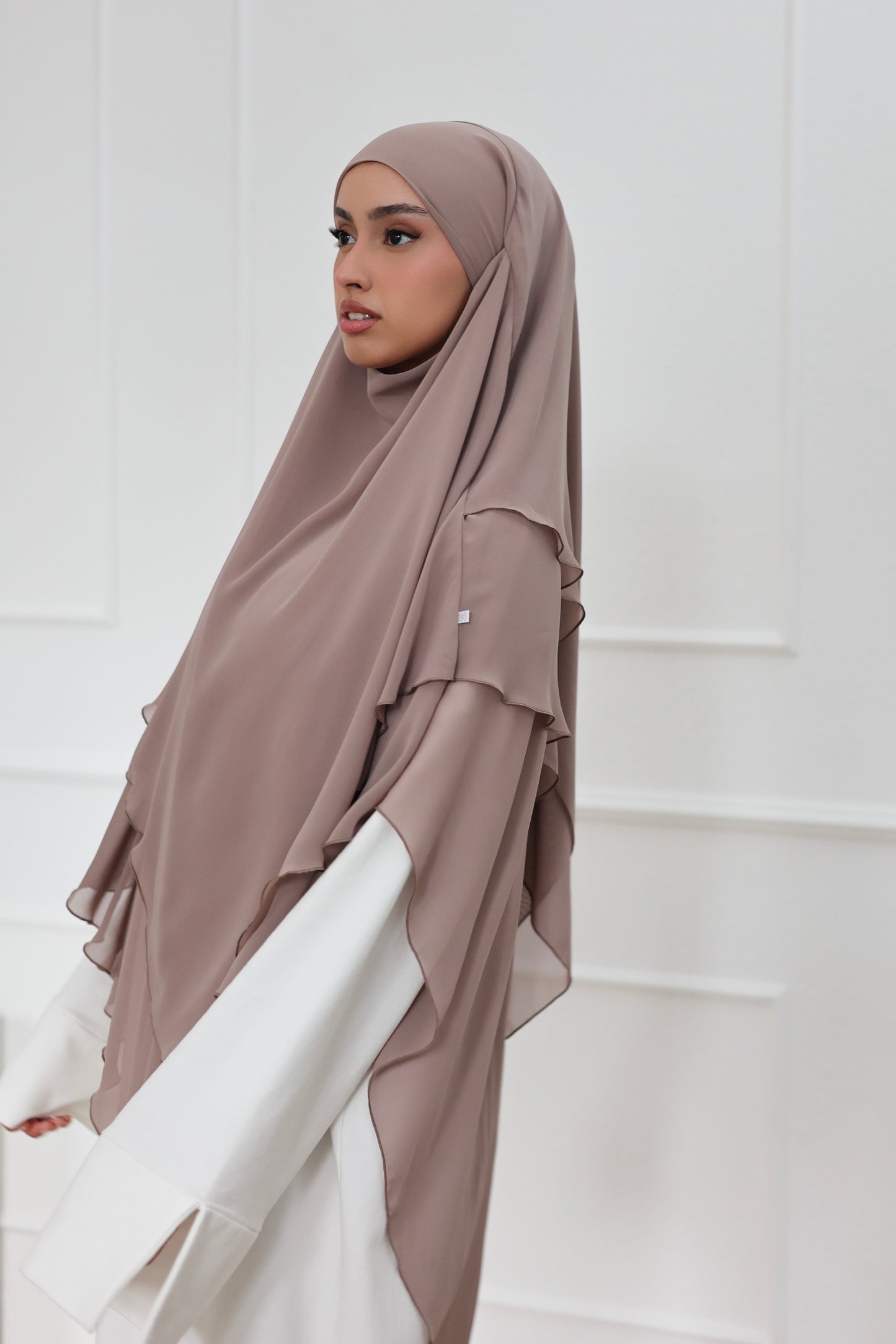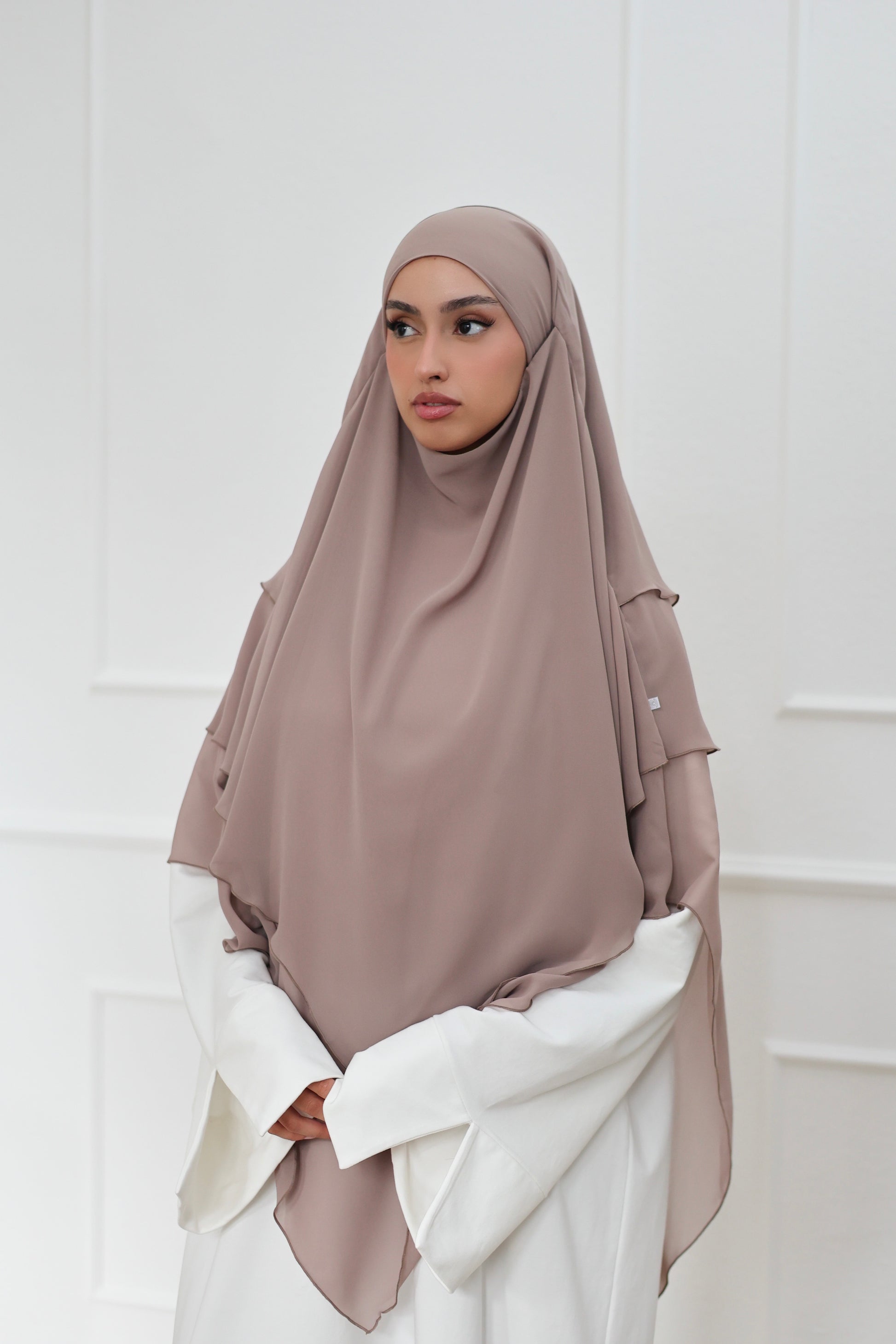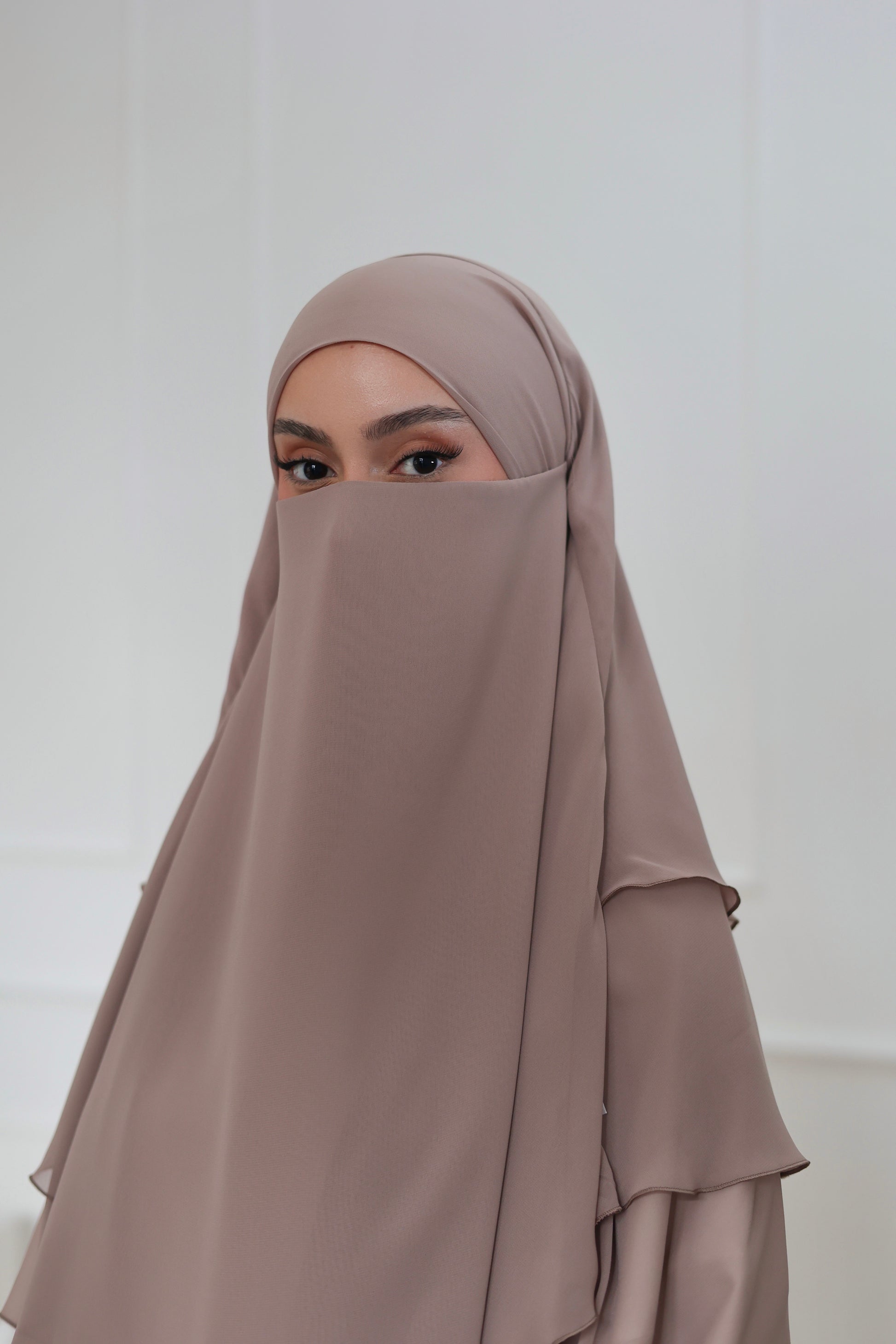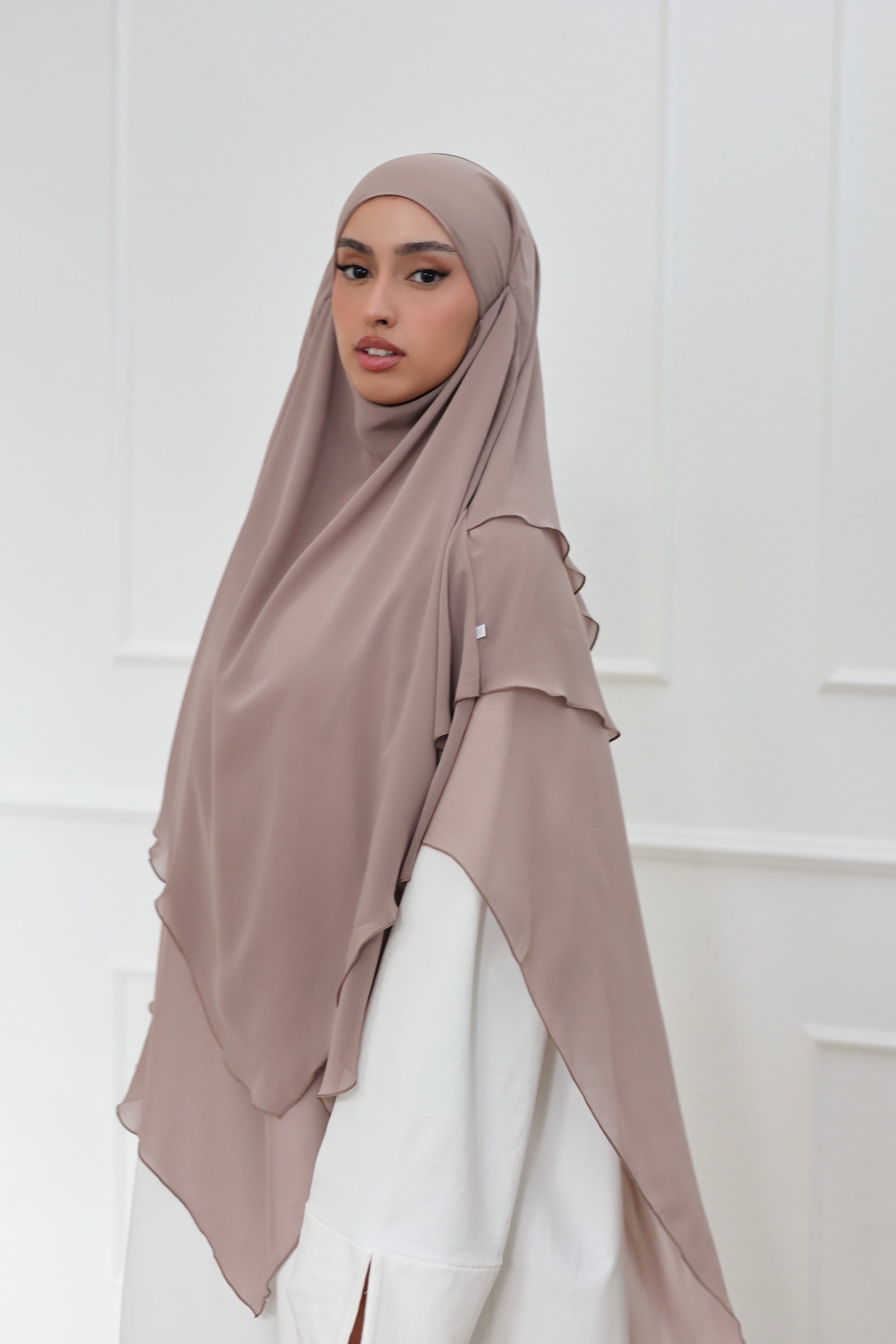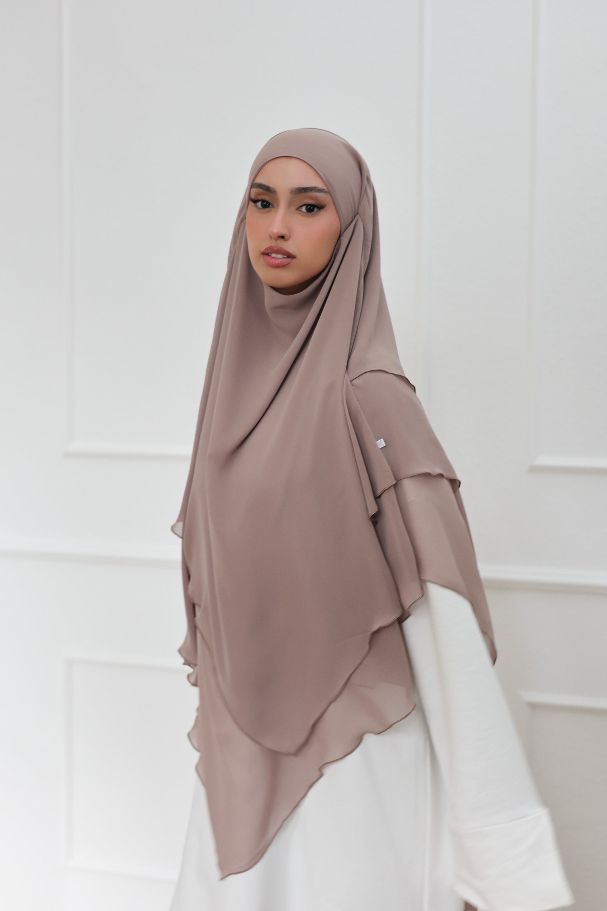 Our three-layer chiffon khimar embodies simple elegance with maximum lightness. Made from high-quality chiffon and sewn with the utmost precision, it offers luxurious fullness and a beautiful drape - and is ultra-light on your head! The generous length and soft feel ensure maximum comfort with optimal coverage. With its romantic design, this khimar is perfect for every occasion and gives your face the most beautiful frame! Be sure to try it - we LOVE it!