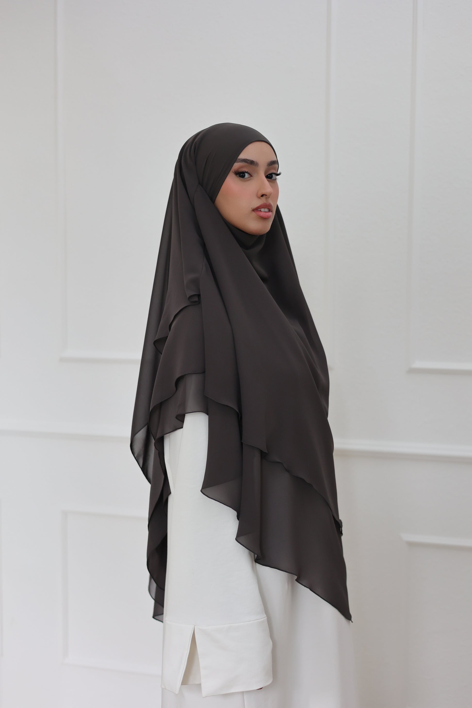 Our three-layer chiffon khimar embodies simple elegance with maximum lightness. Made from high-quality chiffon and sewn with the utmost precision, it offers luxurious fullness and a beautiful drape - and is ultra-light on your head! The generous length and soft feel ensure maximum comfort with optimal coverage. With its romantic design, this khimar is perfect for every occasion and gives your face the most beautiful frame! Be sure to try it - we LOVE it!