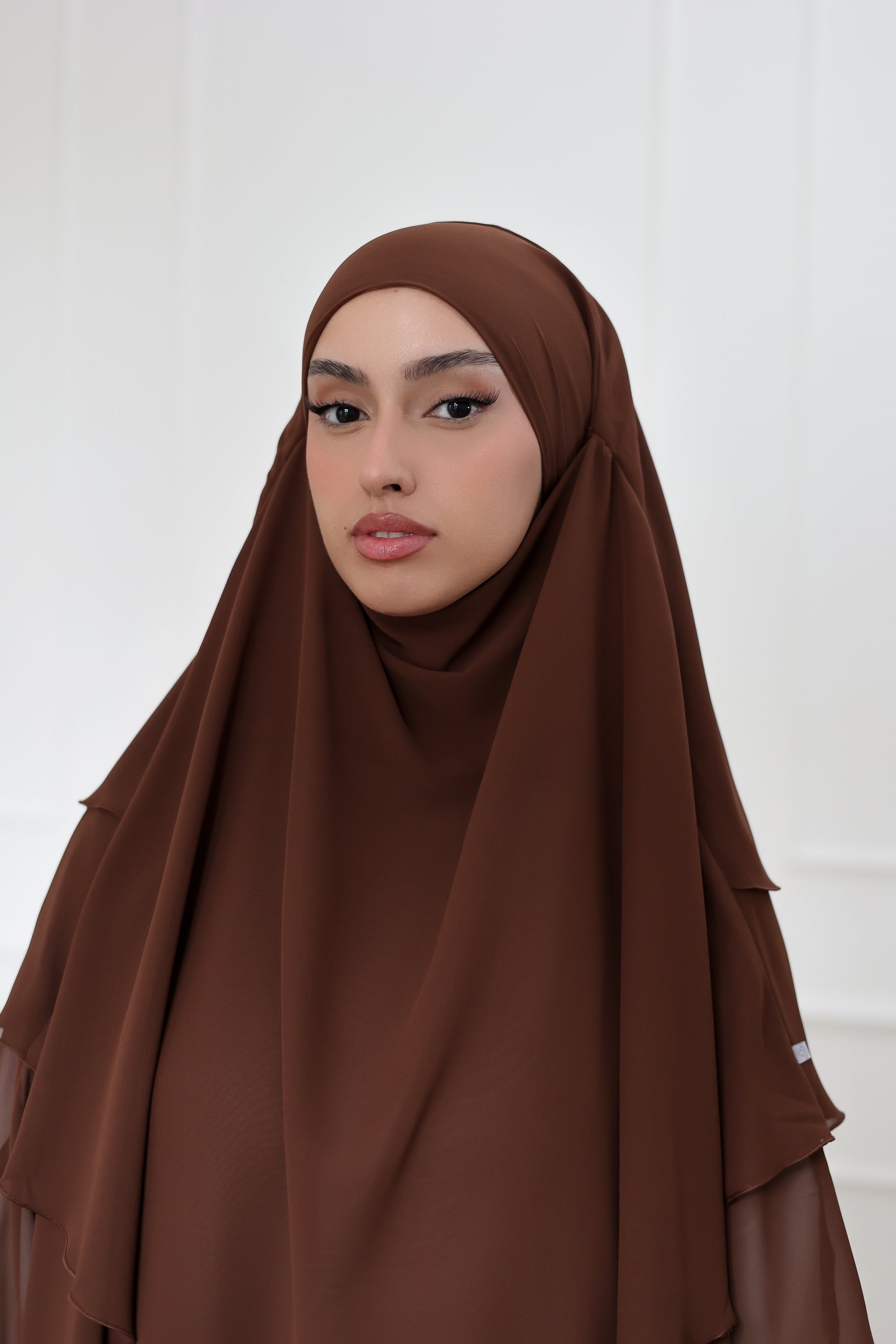 Our three-layer chiffon khimar embodies simple elegance with maximum lightness. Made from high-quality chiffon and sewn with the utmost precision, it offers luxurious fullness and a beautiful drape - and is ultra-light on your head! The generous length and soft feel ensure maximum comfort with optimal coverage. With its romantic design, this khimar is perfect for every occasion and gives your face the most beautiful frame! Be sure to try it - we LOVE it!