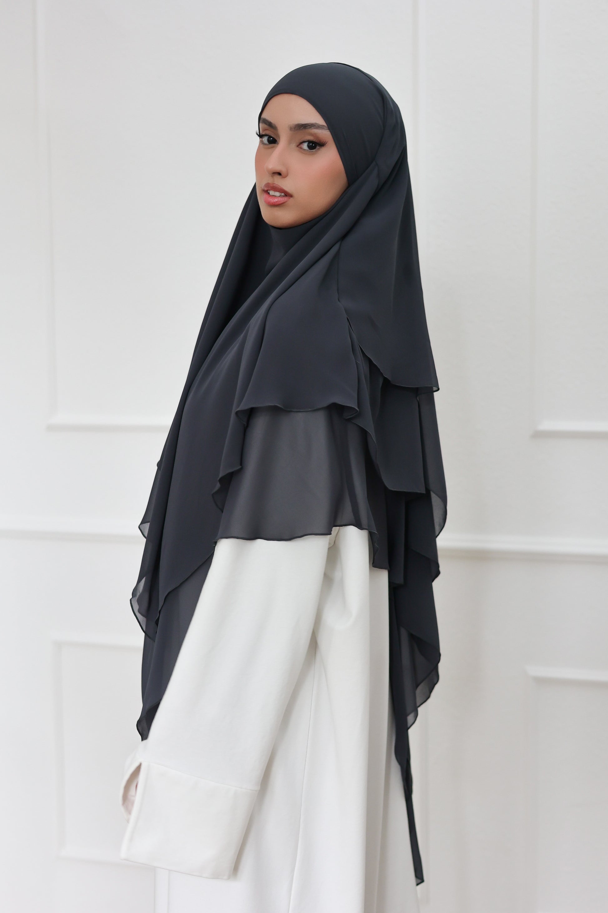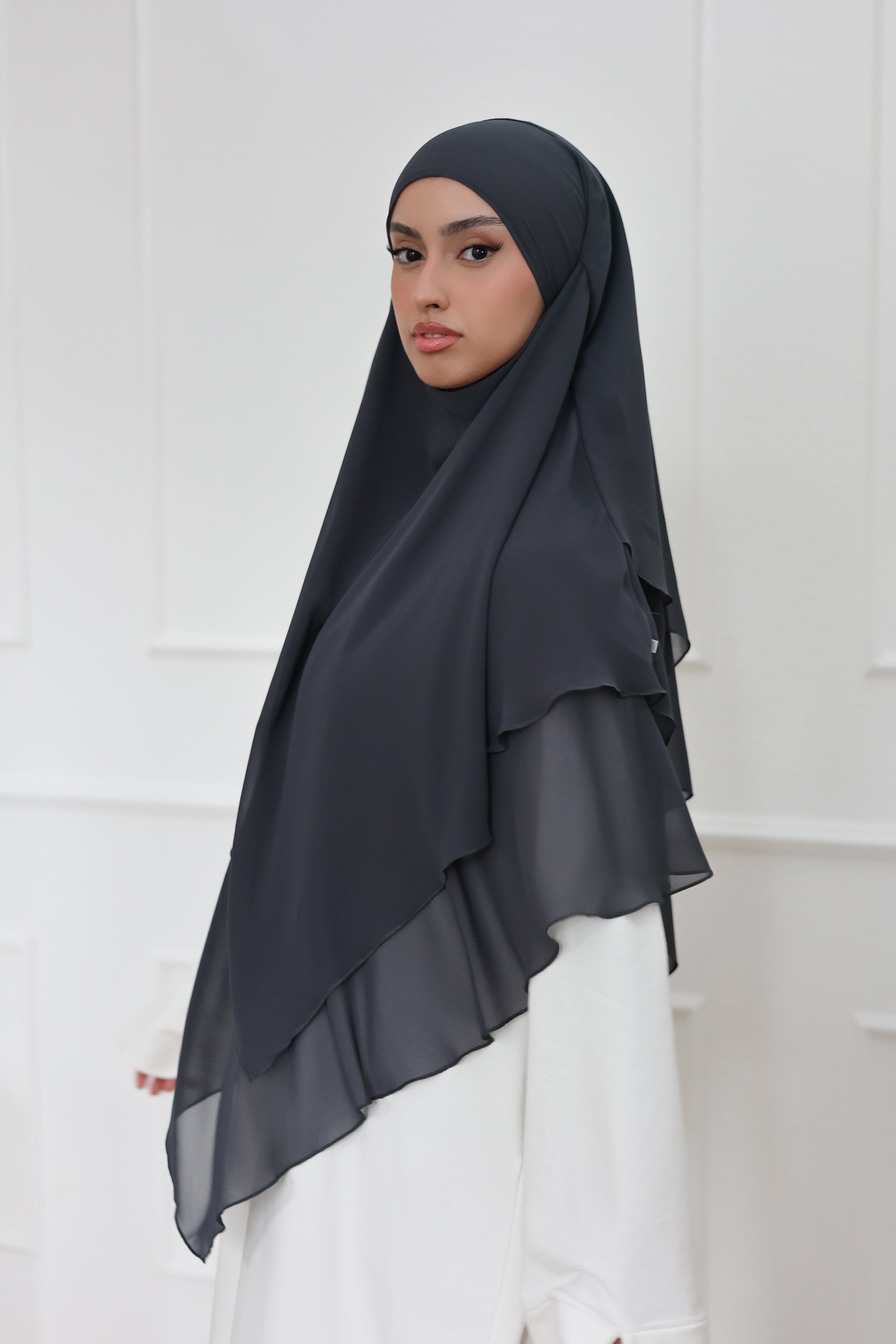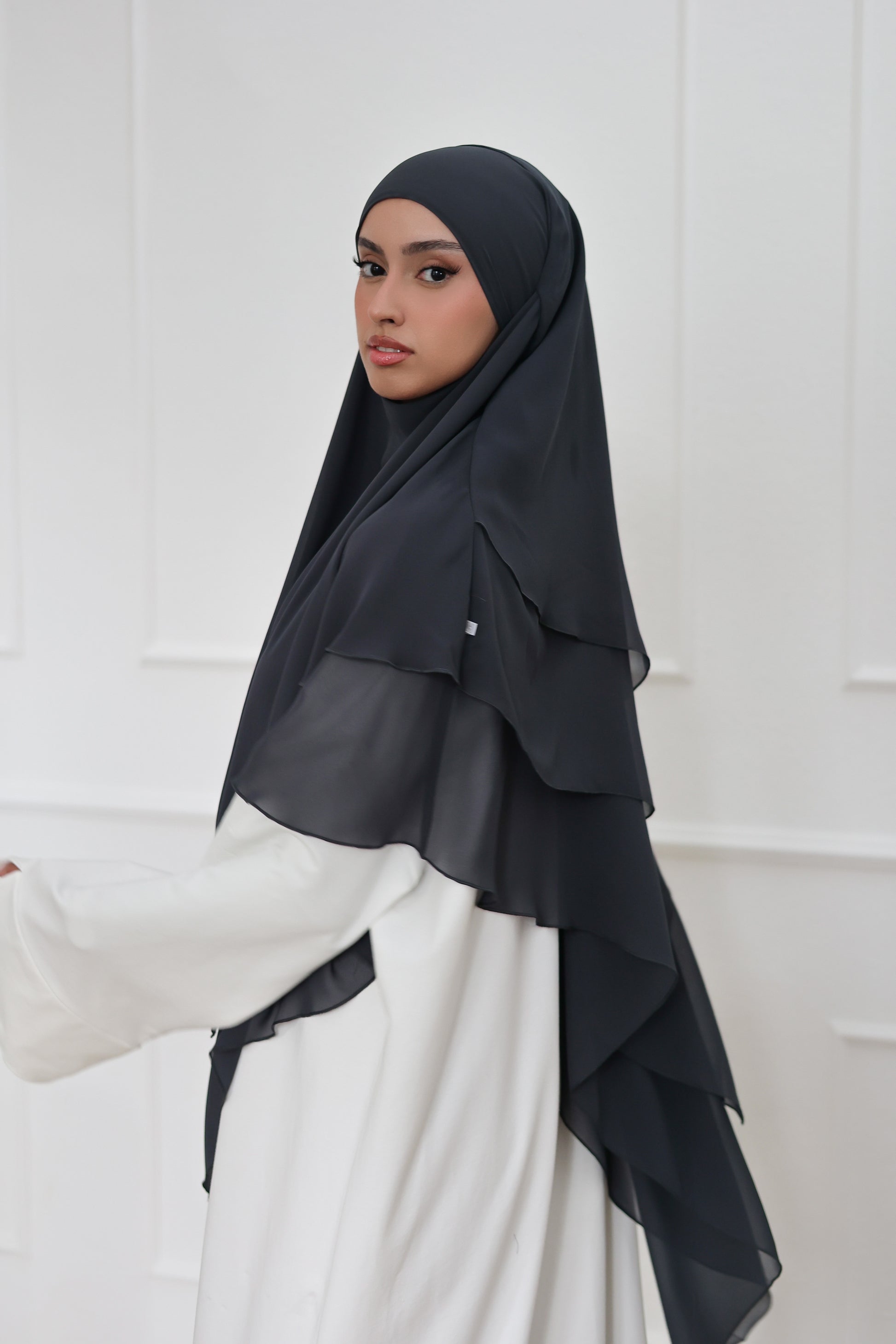 Our three-layer chiffon khimar embodies simple elegance with maximum lightness. Made from high-quality chiffon and sewn with the utmost precision, it offers luxurious fullness and a beautiful drape - and is ultra-light on your head! The generous length and soft feel ensure maximum comfort with optimal coverage. With its romantic design, this khimar is perfect for every occasion and gives your face the most beautiful frame! Be sure to try it - we LOVE it!