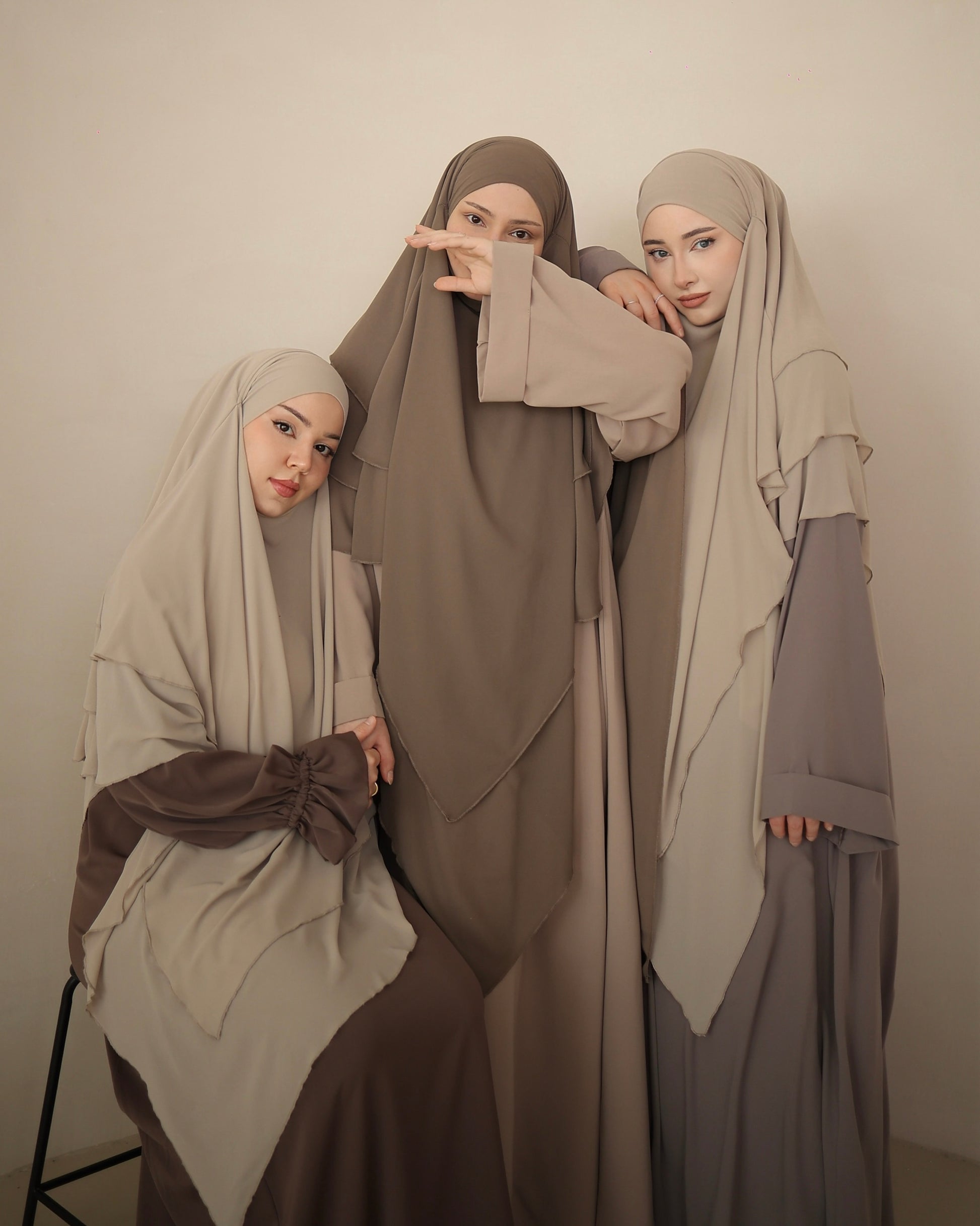 Consisting of 5 limited colours of our three-layer chiffon khimars, this collection reflects the beauty of muted colours.