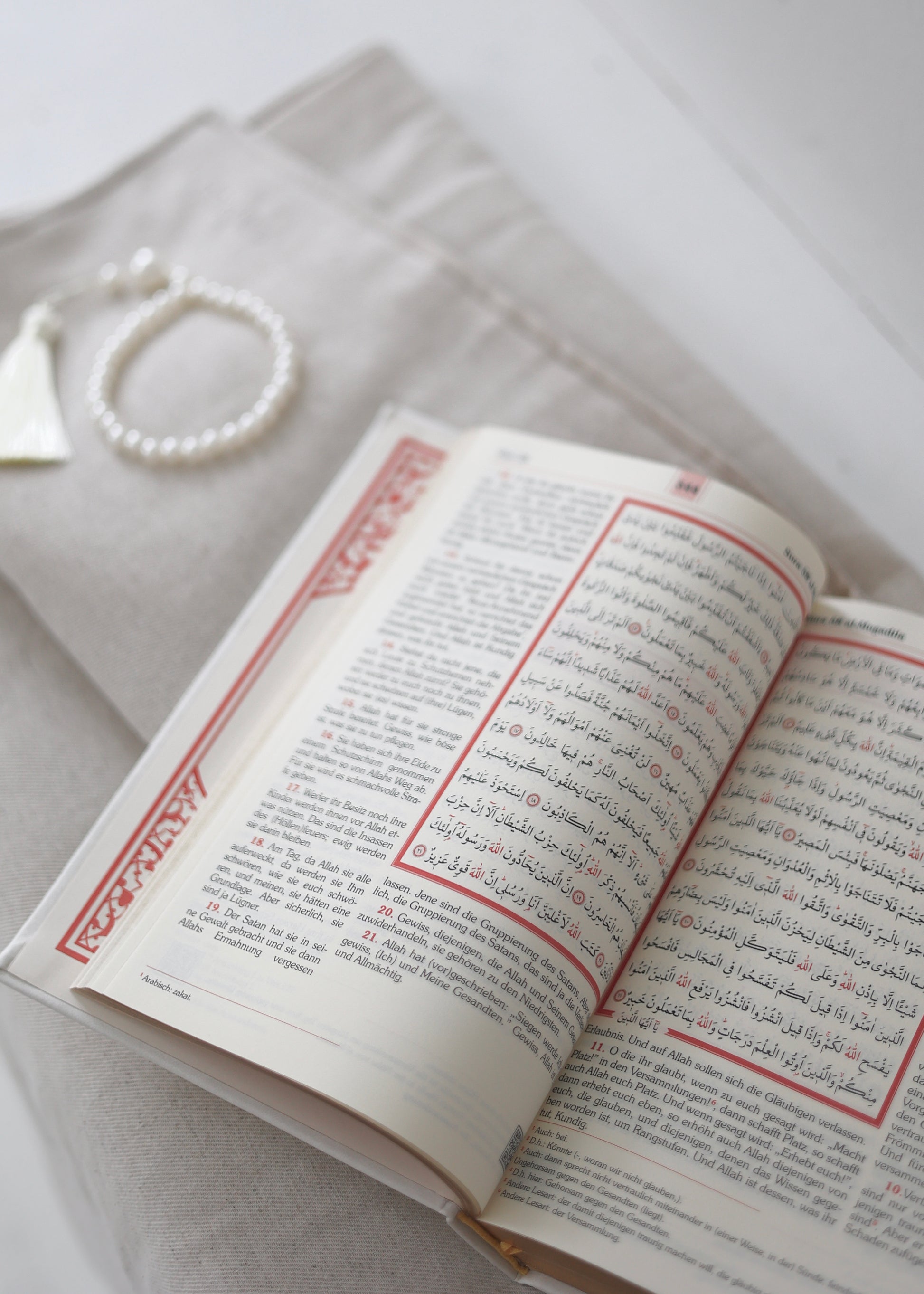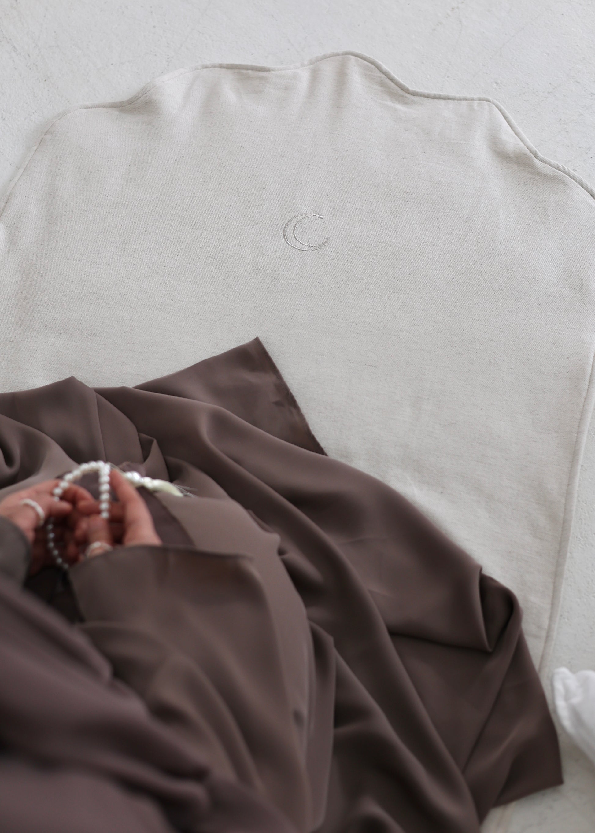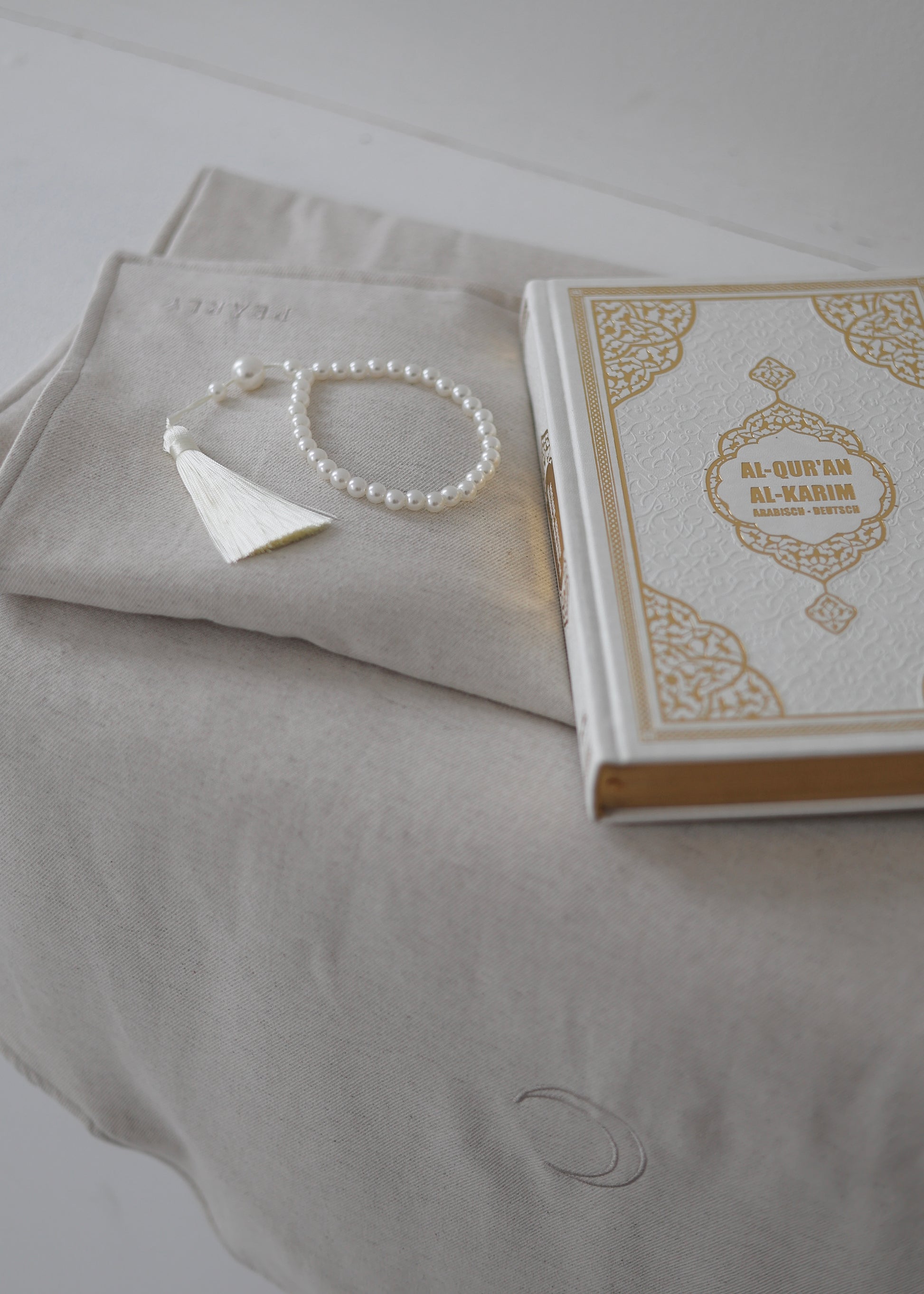 With this set you get everything you need for this month: our new linen prayer rug, our pearl prayer beads and a charity Quran, of which 10€ will be donated to charity in your name.