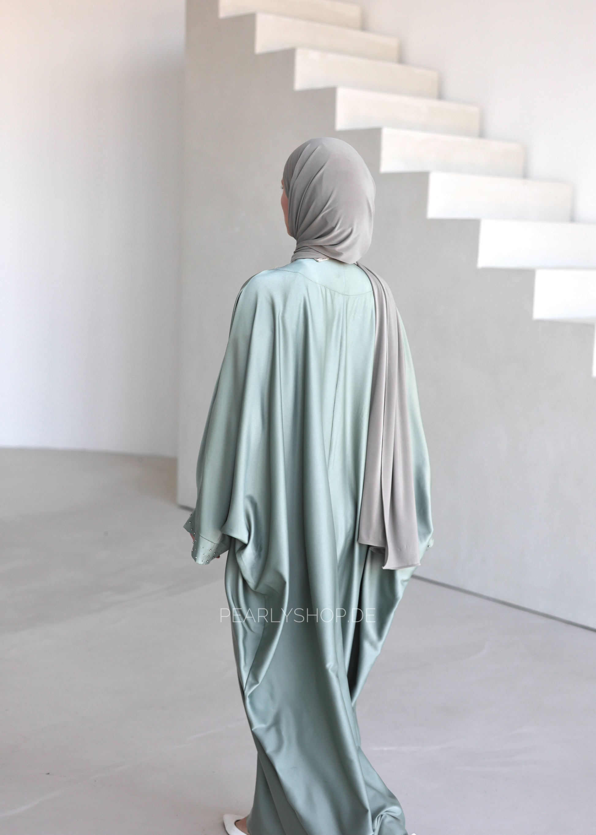 Diese traumhafte Abaya in einem zarten Grün ist die perfekte Wahl für festliche Anlässe wie Eid. Ihr fließender Schnitt sorgt für eine elegante Silhouette, während die aufwendig bestickten Details entlang des Ausschnitts und der Ärmel dezente, aber luxuriöse Akzente setzen.