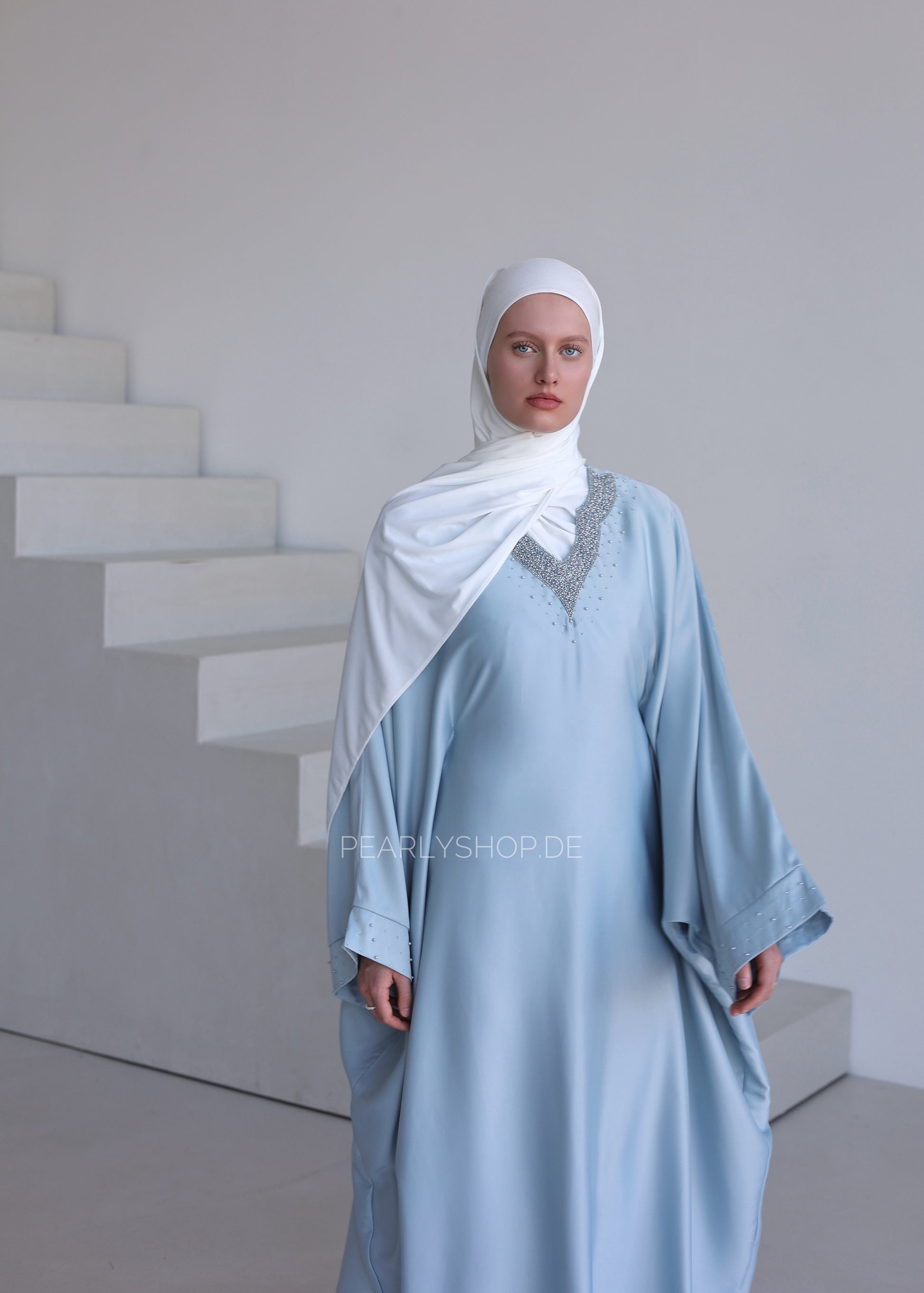 Diese traumhafte Abaya in einem zarten Himmelblau ist die perfekte Wahl für festliche Anlässe wie Eid. Ihr fließender Schnitt sorgt für eine elegante Silhouette, während die aufwendig bestickten Details entlang des Ausschnitts und der Ärmel dezente, aber luxuriöse Akzente setzen.