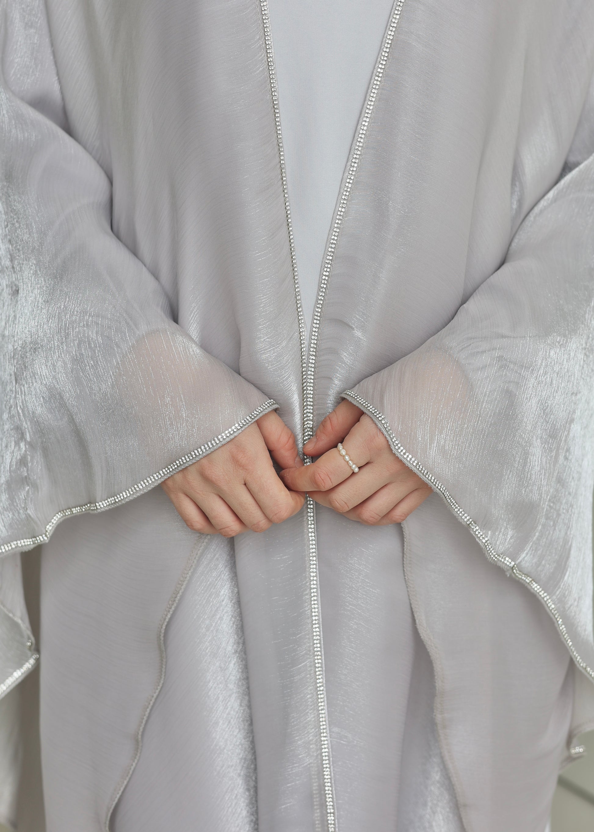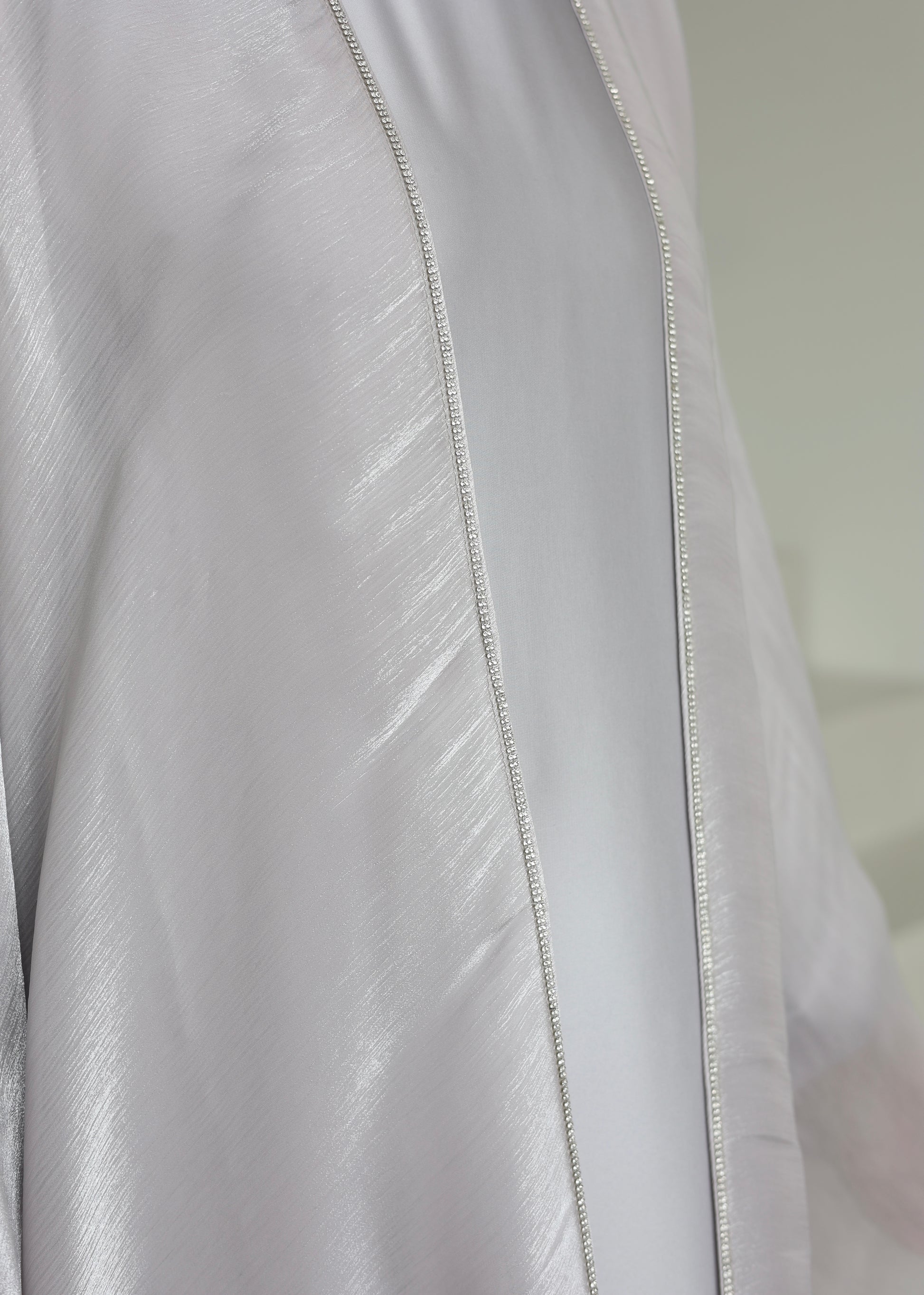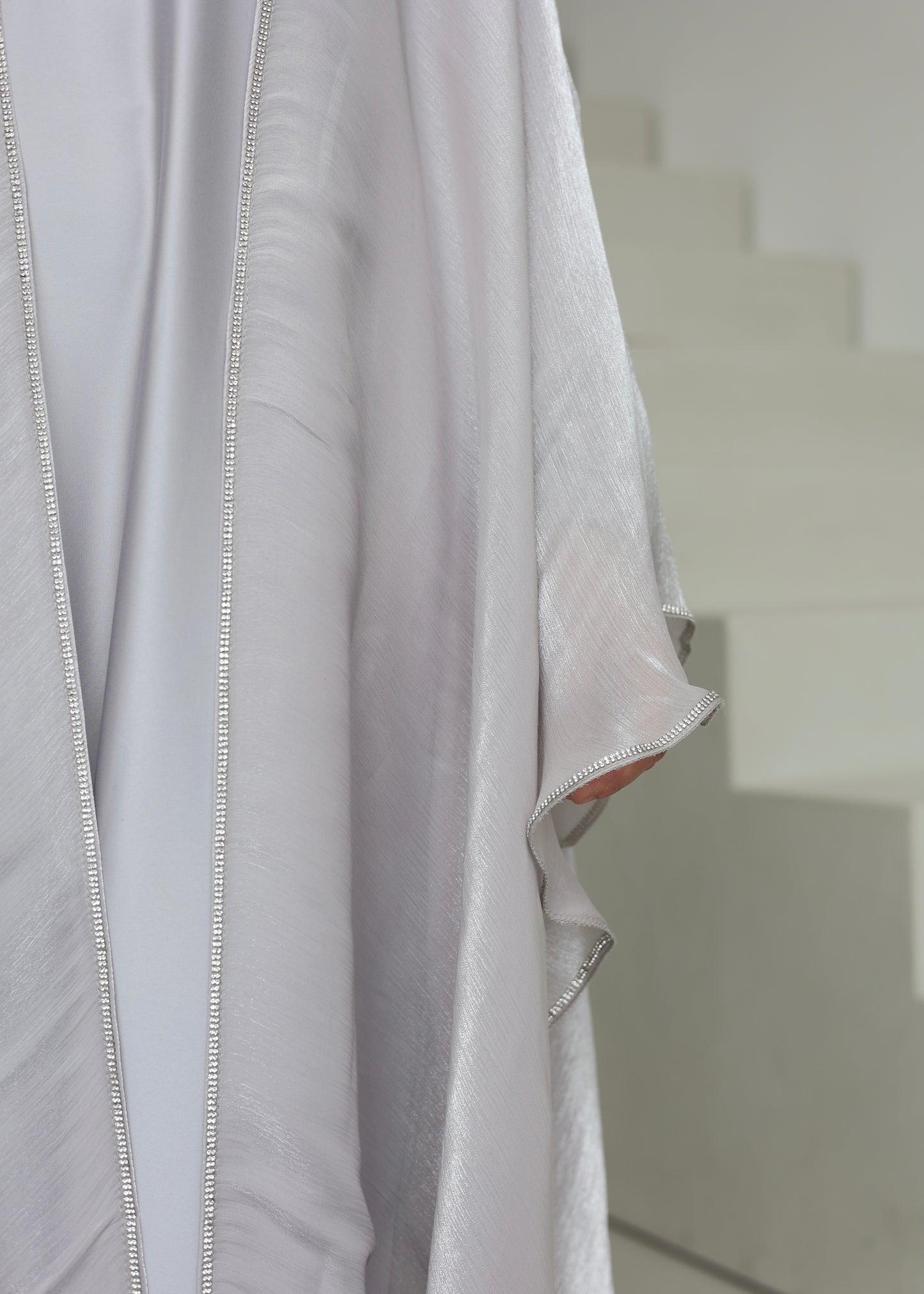 Unsere Moonlight Abaya ist ein echtes Statement-Piece – stilvoll, elegant und mit maximaler Bedeckung, ganz ohne Kompromisse beim Design. Sie besteht aus einem seidig langärmligen Unterkleid mit elastischem Gummizug an den Ärmeln für angenehmen Tragekomfort. Darüber fällt ein traumhafter, schimmernder Organza-Überwurf, der mit zarten Steinchen entlang des Saums veredelt ist und bei jedem Schritt dezent glitzert – wie Mondlicht auf Wasser.