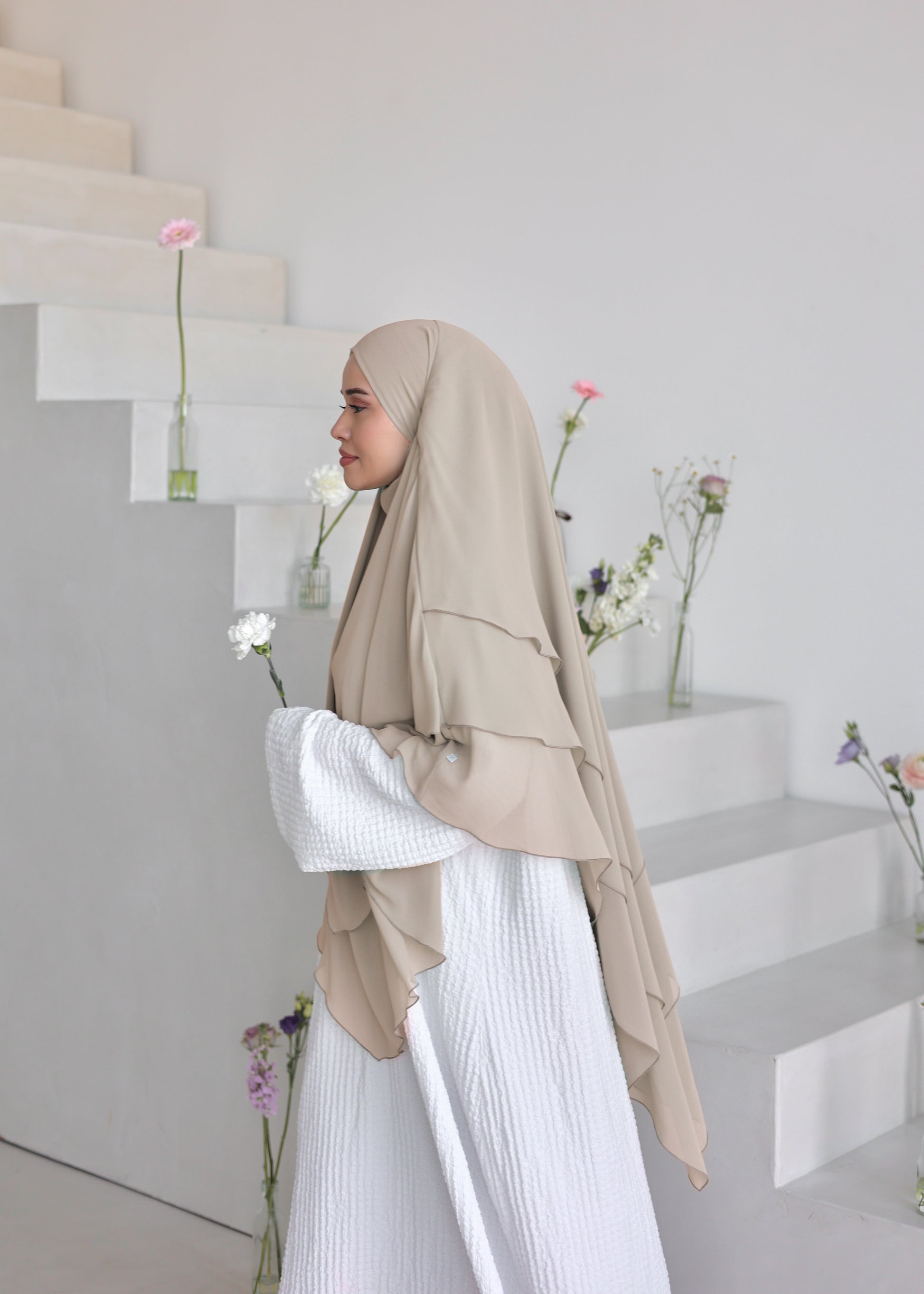 Unser dreilagiger Chiffon Khimar verkörpert schlichte Eleganz mit maximaler Leichtigkeit. Hergestellt aus hochwertigem Chiffon und vernäht mit größter Präzision, bietet er eine luxuriöse Fülle und einen schönen Fall - und ist dabei ultralcht auf deinem Kopf! Die großzügige Länge und der weiche Griff sorgen für maximalen Tragekomfort bei optimaler Bedeckung. Mit seinem romantischen Design ist dieser Khimar perfekt für jeden Anlass und verleiht deinem Gesicht die schönste Umrandung! Probier‘s unbedingt aus - wir LIEBEN es!