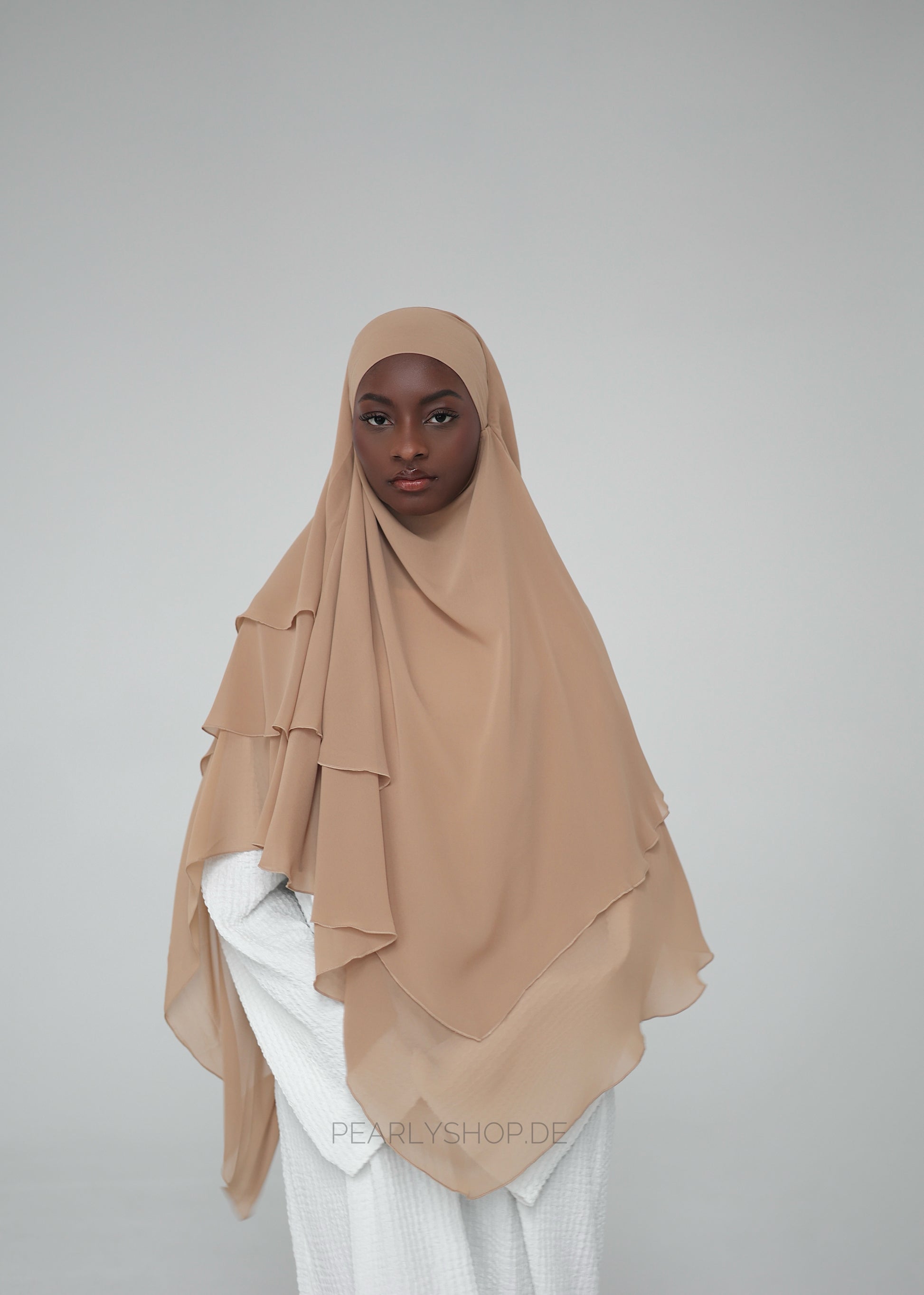 Unser dreilagiger Chiffon Khimar verkörpert schlichte Eleganz. Hergestellt aus hochwertigem Chiffon und vernäht mit größter Präzision, bietet er eine luxuriöse Fülle und einen schönen Fall. Die großzügige Länge und der weiche Griff sorgen für maximalen Tragekomfort bei optimaler Bedeckung. Mit seinem romantischen Design ist dieser Khimar perfekt für jeden Anlass und verleiht deinem Gesicht die schönste Umrandung! Probier‘s unbedingt aus - wir LIEBEN es!