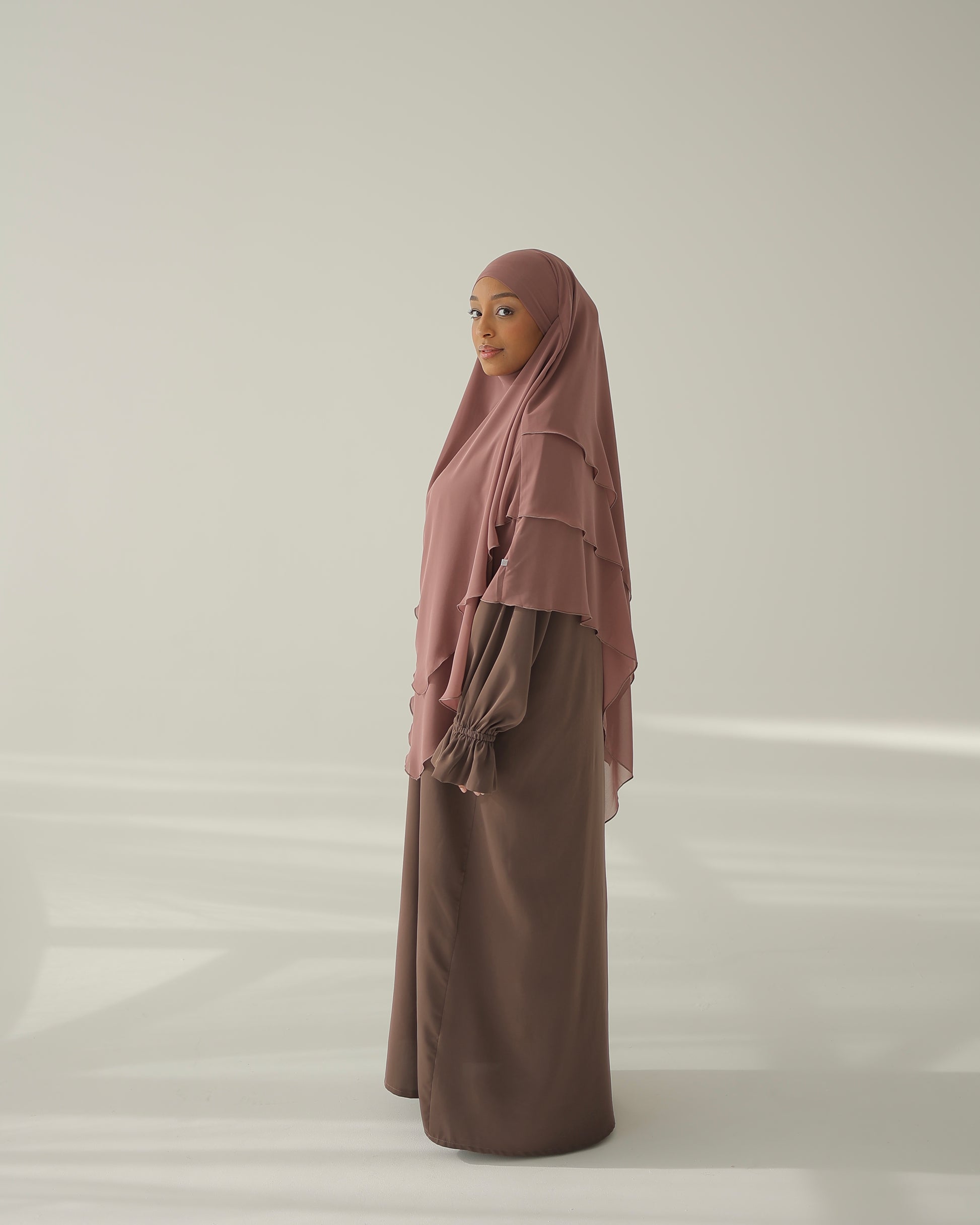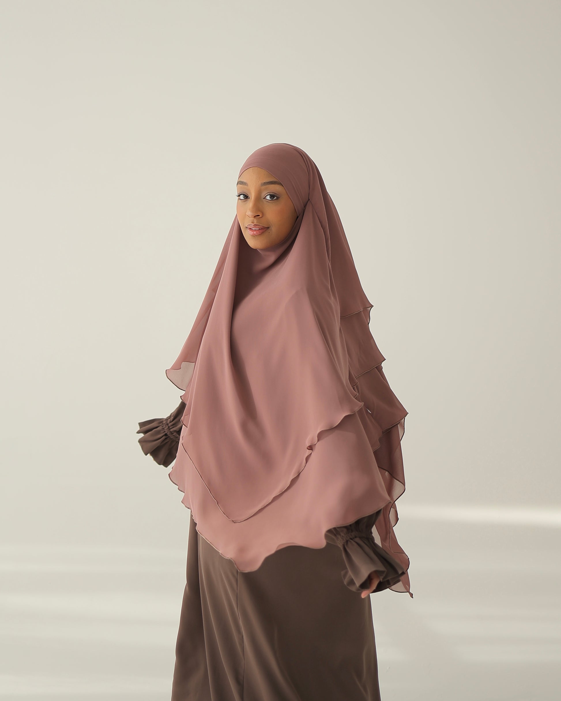 Unser dreilagiger Chiffon Khimar verkörpert schlichte Eleganz. Hergestellt aus hochwertigem Chiffon und vernäht mit größter Präzision, bietet er eine luxuriöse Fülle und einen schönen Fall. Die großzügige Länge und der weiche Griff sorgen für maximalen Tragekomfort bei optimaler Bedeckung. Mit seinem romantischen Design ist dieser Khimar perfekt für jeden Anlass und verleiht deinem Gesicht die schönste Umrandung! Probier‘s unbedingt aus - wir LIEBEN es!