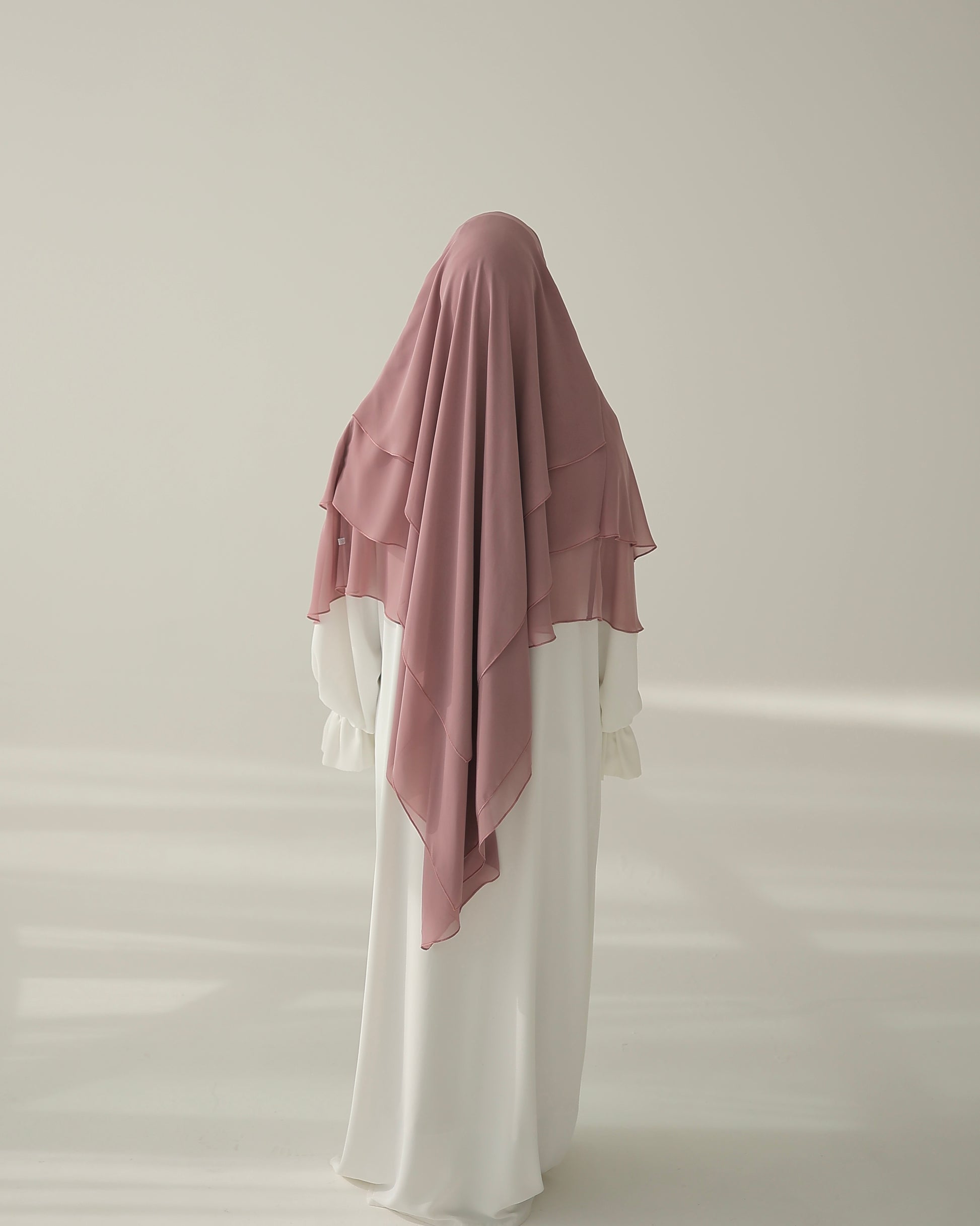 Unser dreilagiger Chiffon Khimar verkörpert schlichte Eleganz. Hergestellt aus hochwertigem Chiffon und vernäht mit größter Präzision, bietet er eine luxuriöse Fülle und einen schönen Fall. Die großzügige Länge und der weiche Griff sorgen für maximalen Tragekomfort bei optimaler Bedeckung. Mit seinem romantischen Design ist dieser Khimar perfekt für jeden Anlass und verleiht deinem Gesicht die schönste Umrandung! Probier‘s unbedingt aus - wir LIEBEN es!