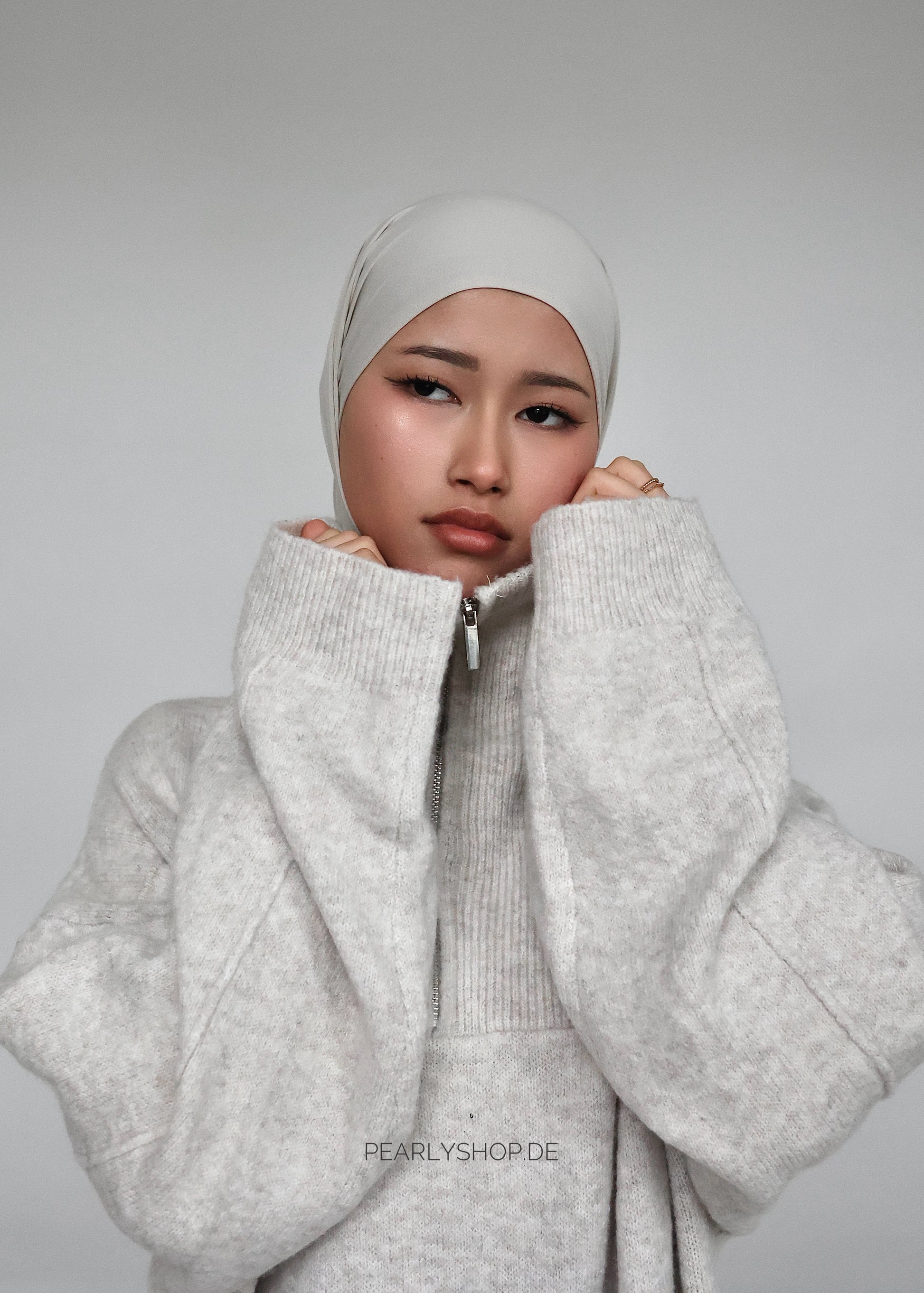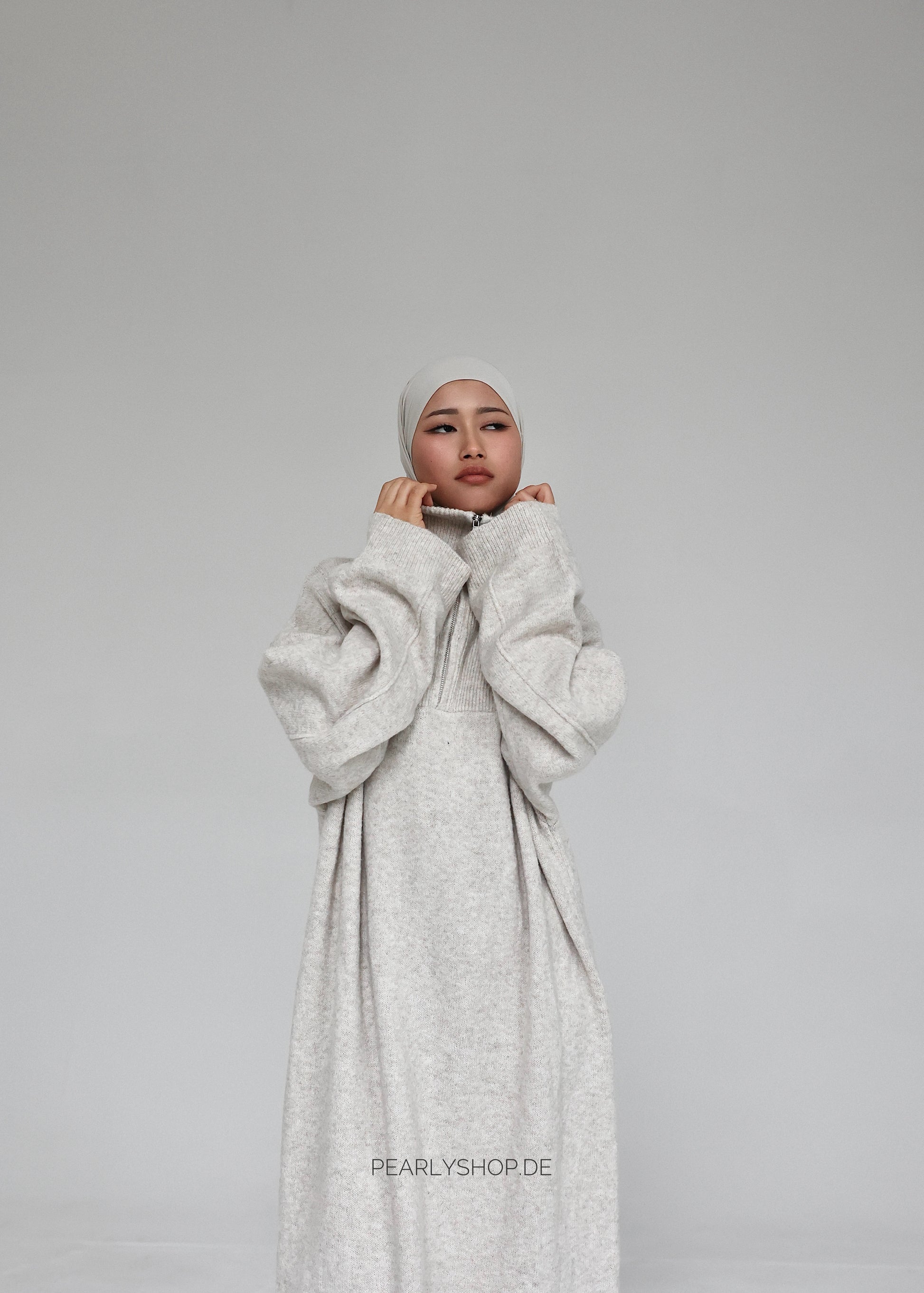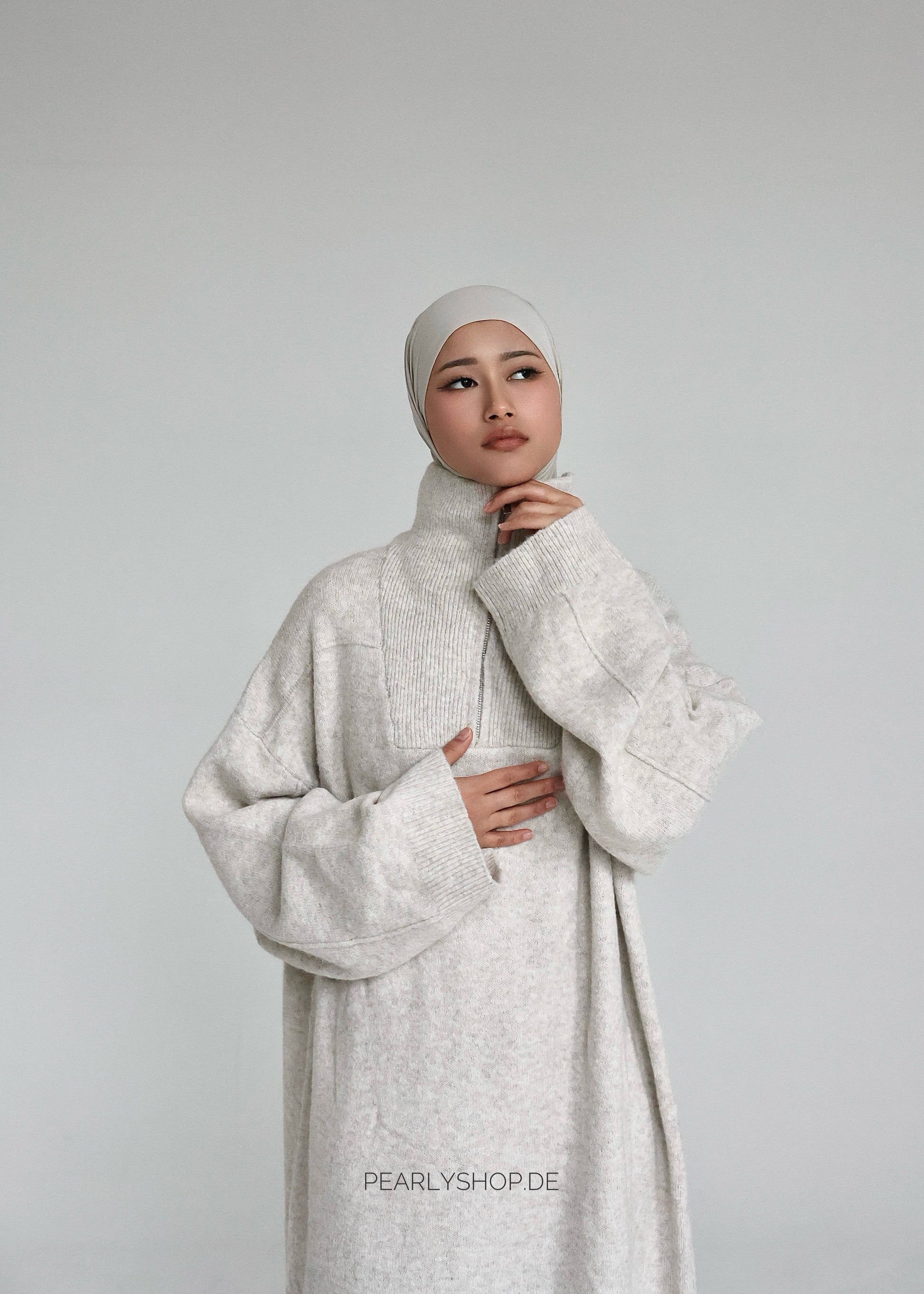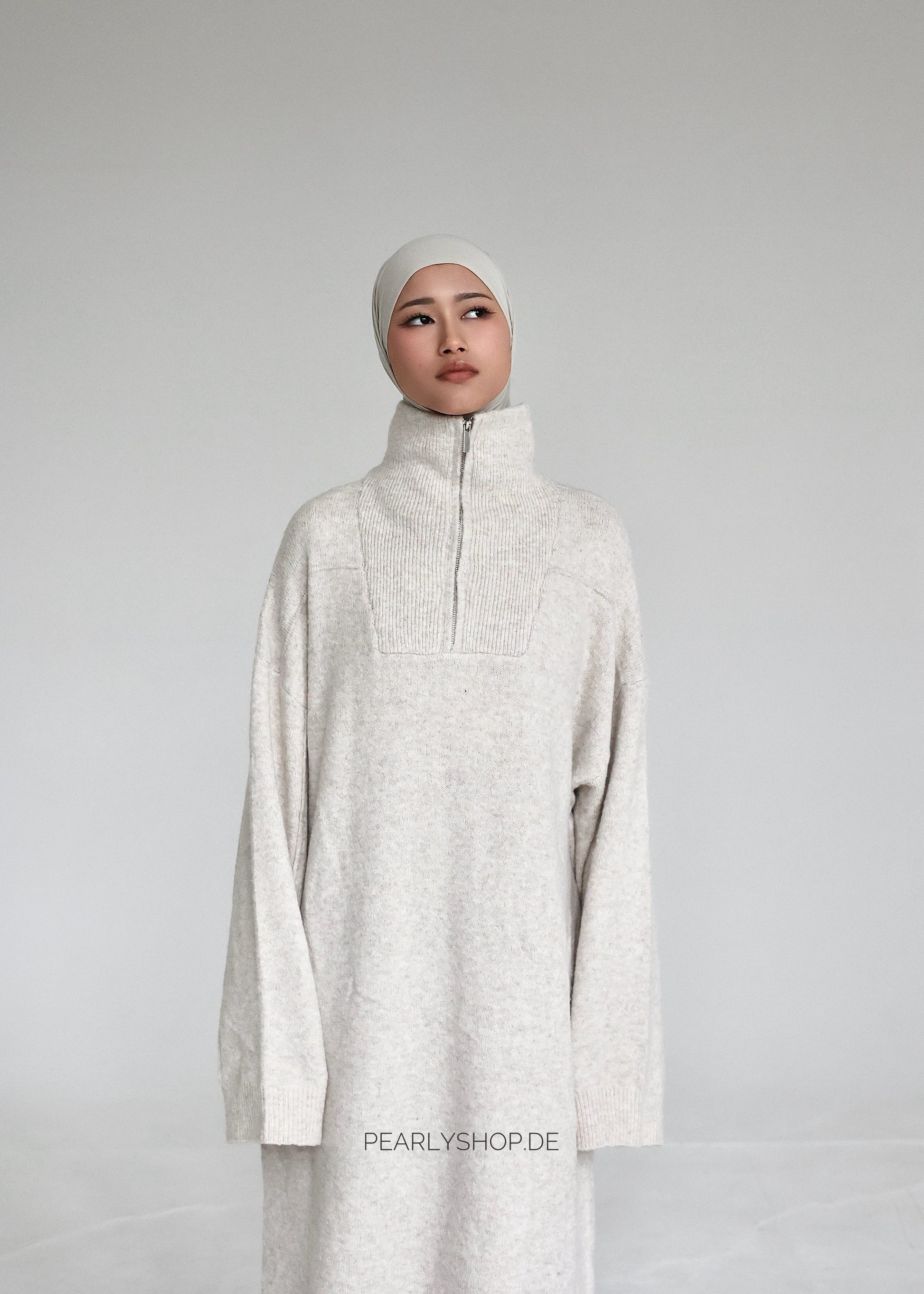 Dieses elegante Maxi-Pulloverkleid vereint Komfort, Wärme und einen modernen, modesten Look. Der lange Stehkragen mit Zipper lässt sich individuell stylen: hochgeschlossen für kalte Tage oder lässig umgeklappt für einen entspannten Look. Der weite, fließende Schnitt sorgt für maximale Bewegungsfreiheit und eine schmeichelhafte Silhouette.